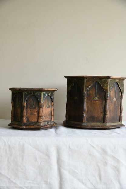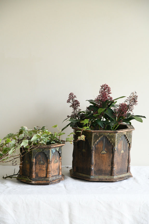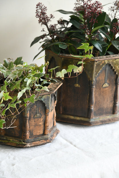 Pair Eastern Wooden Hexagonal Planters. Pair wooden hexagonal planters with brass mounts.