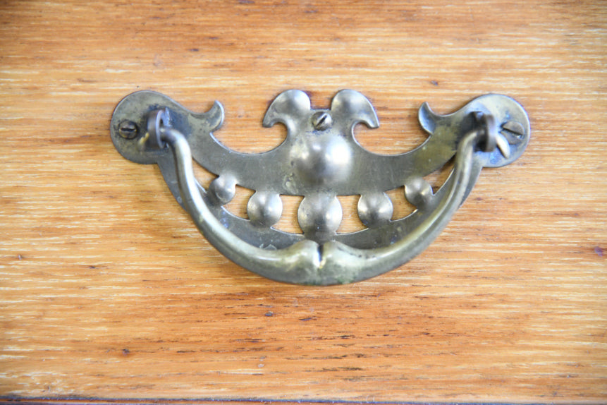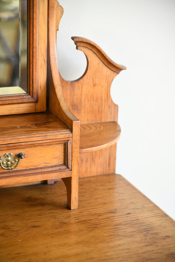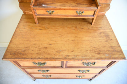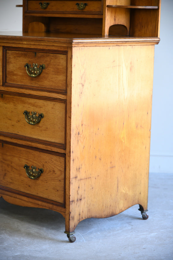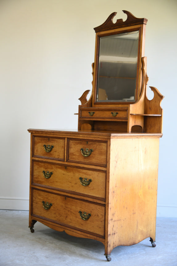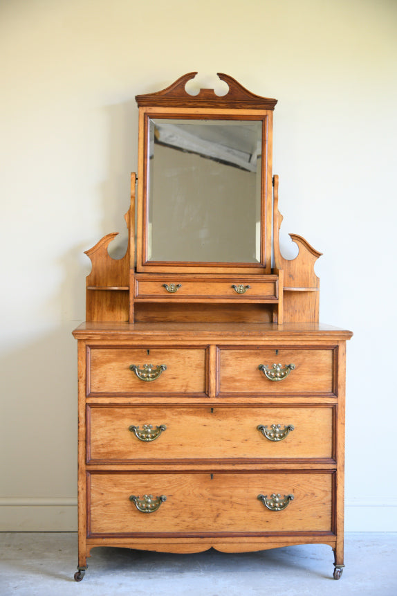 Edwardian Dressing Chest. Edwardian ash dressing chest, the adjustable mirror with bevel edge glass and scrolled pediment with small drawer below. Arrangement of two short drawers over two long drawers on short square legs and castors.