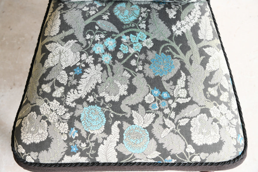 Victorian Prie Dieu Bedroom Chair. Antique Victorian prayer chair, upholstered in blue and grey floral fabric on short mahogany turned and faceted legs and castors.