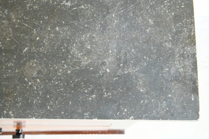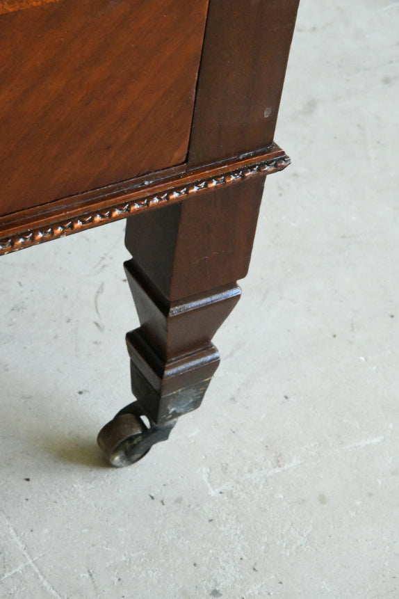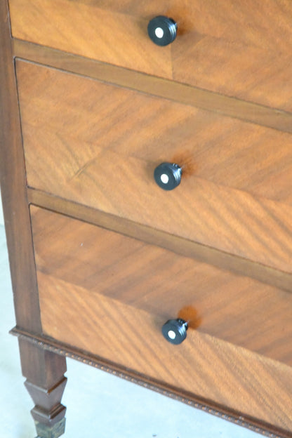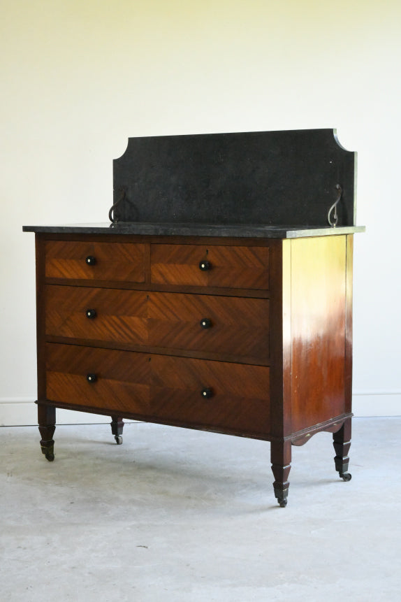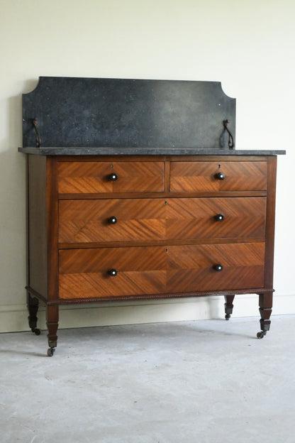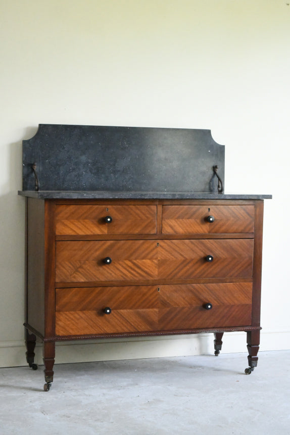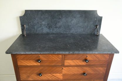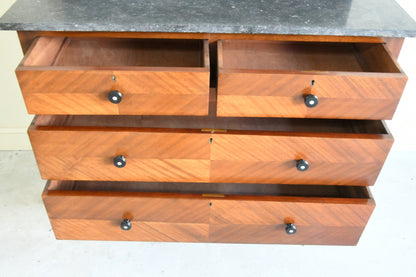 Limestone Chest of Drawers. Early 20th Century chest of drawers, solid limestone top with upstand, sapele book matched veneer drawer fronts with bakelite handles on short square legs and castors.