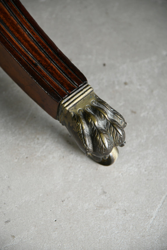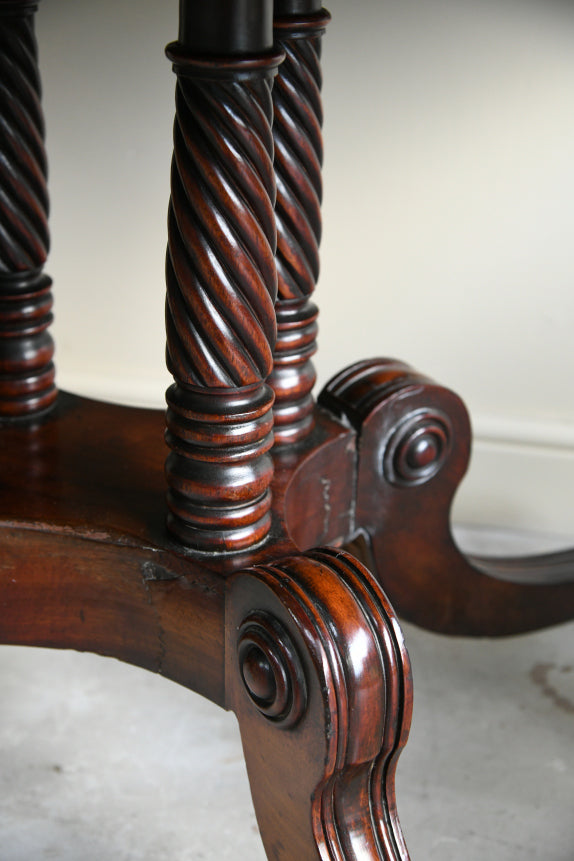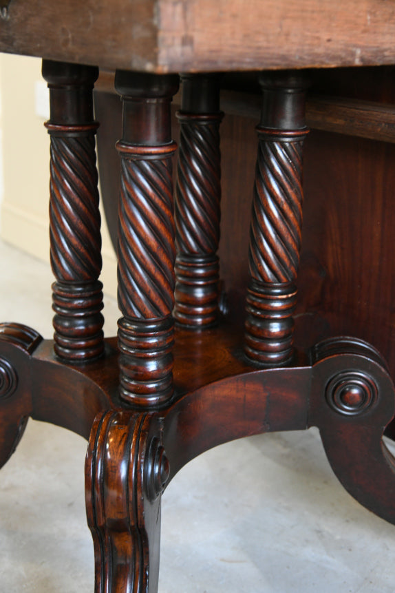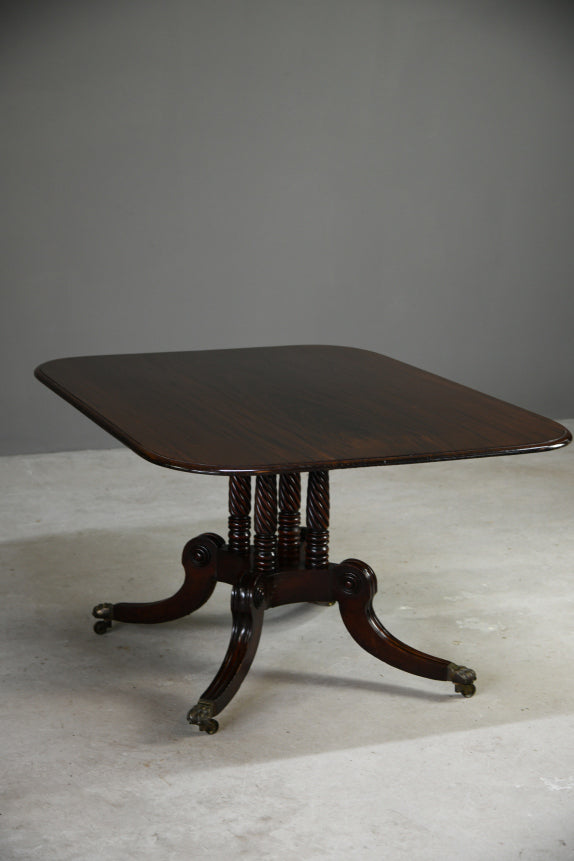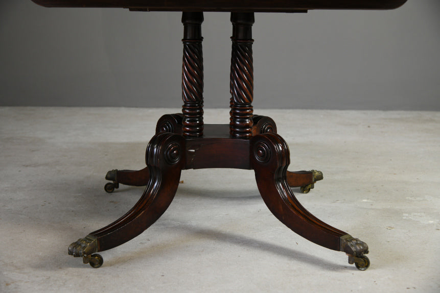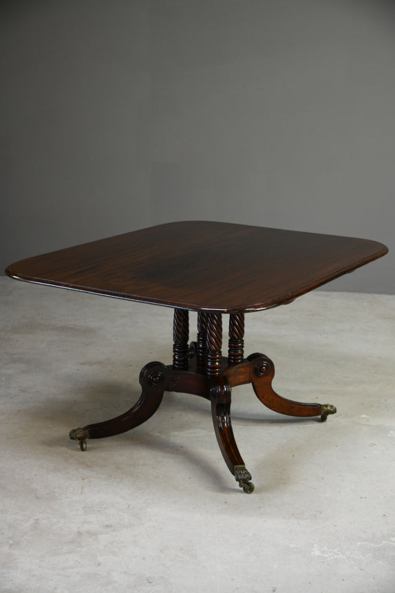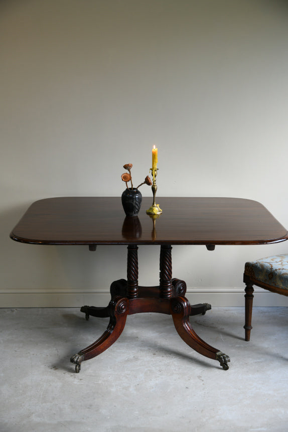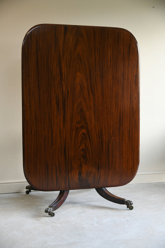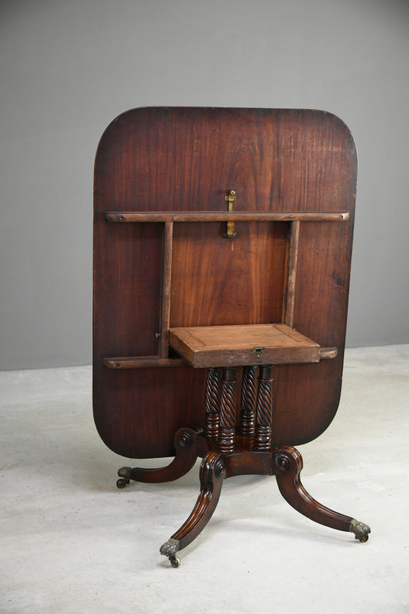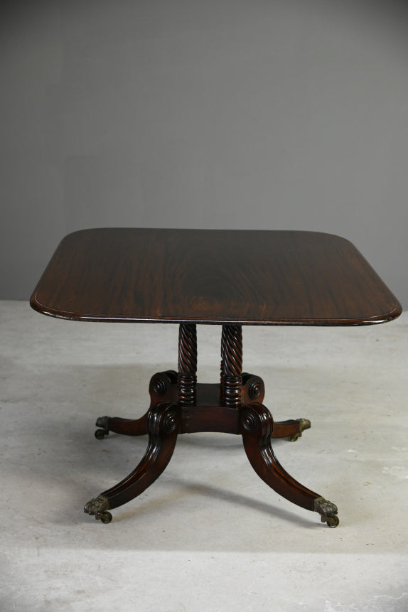 Regency Mahogany Tilt Top Breakfast Table. Early 19th Century rectangular tilt top breakfast table, solid mahogany top on four spiral-twist supports, scroll legs with brass paw caps and casters