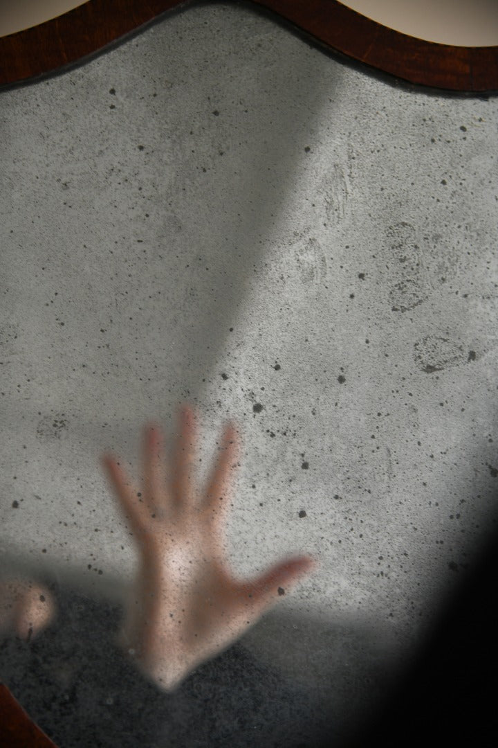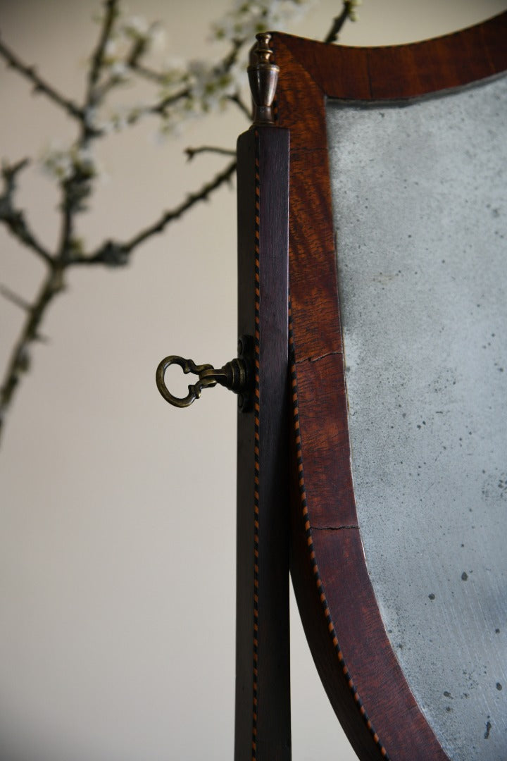 Georgian Dressing Table Mirror. George III toilet mirror, shield shaped mirror in a mahogany frame on inlaid supports & serpentine box base with three small drawers.