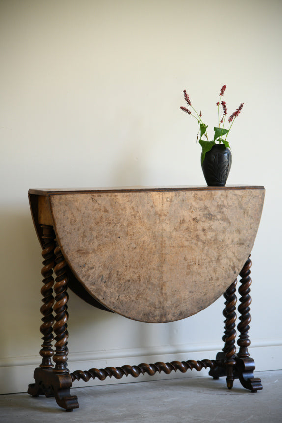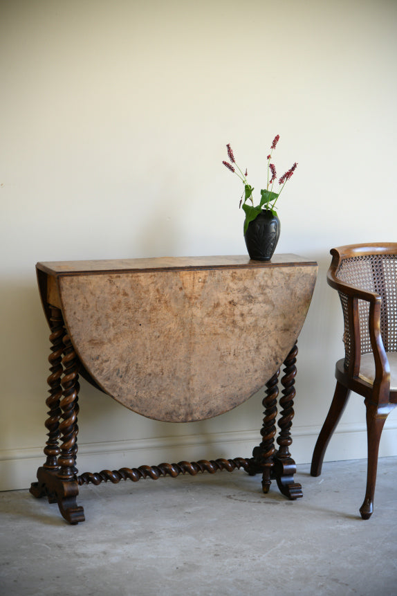 Antique Walnut Drop Leaf Table. Victorian occasional drop leaf table, the oval walnut veneered top on barley twist supports and central stretcher.