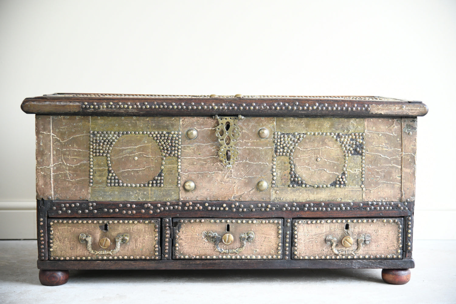 Antique Brass & Padouk Zanzibar Chest. A striking antique studded chest, clad in brass and copper panels over a padouk carcass, combining bold decoration with practical storage. The hinged lid is bordered with rows of studs, opening to a spacious interior, while the front displays geometric metal panelwork and an ornate central escutcheon. Below, three small drawers with decorative drop handles provide additional storage. Raised on later turned bun feet.