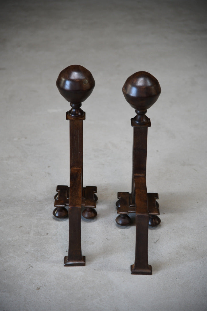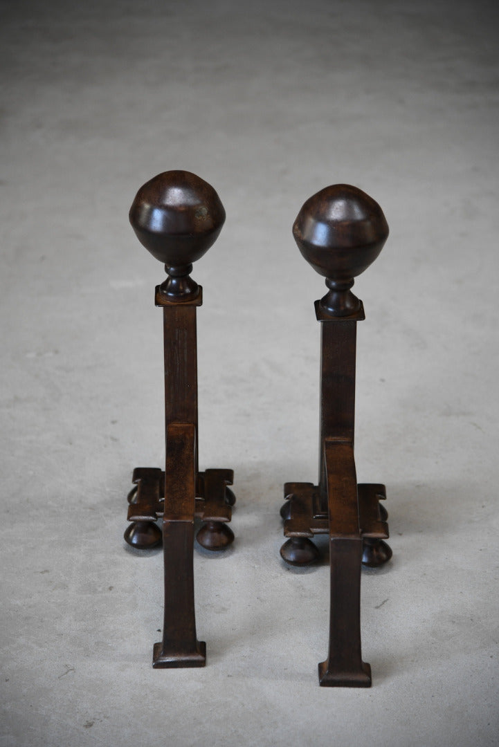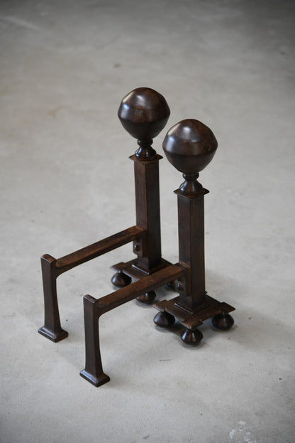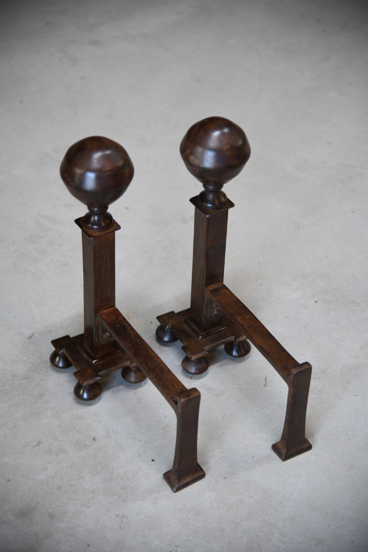 Pair Iron Fire Dogs. Pair of steel fire dogs with large ball finial, waxed finish