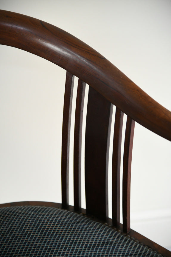 Antique Edwardian Tub Chair. Elegant Edwardian mahogany tub chair, with curved back & sweeping curved arms and finely reeded vertical splats to the backrest, upholstered seat on tapering square legs and spade feet. A refined early 20th century piece, ideal as an occasional chair for a bedroom, hallway or writing desk.