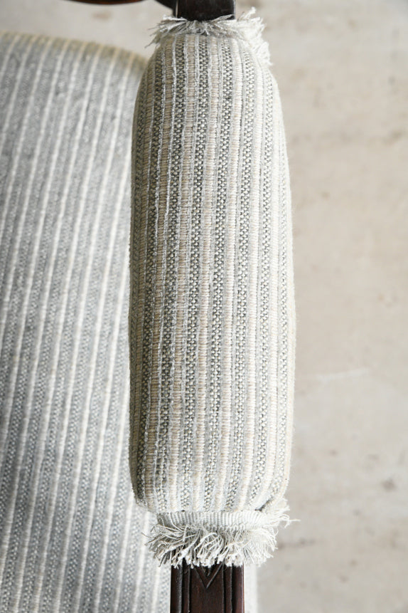 Antique Edwardian Mahogany Open Arm Chair. Antique Edwardian easy chair, mahogany frame with a shield-shaped back and a comfortable sprung seat. It is upholstered in a pale blue striped fabric, with a matching padded back and seat. Pair curved open arms with upholstered pad & original porcelain castors. Recently upholstered and ready to use.