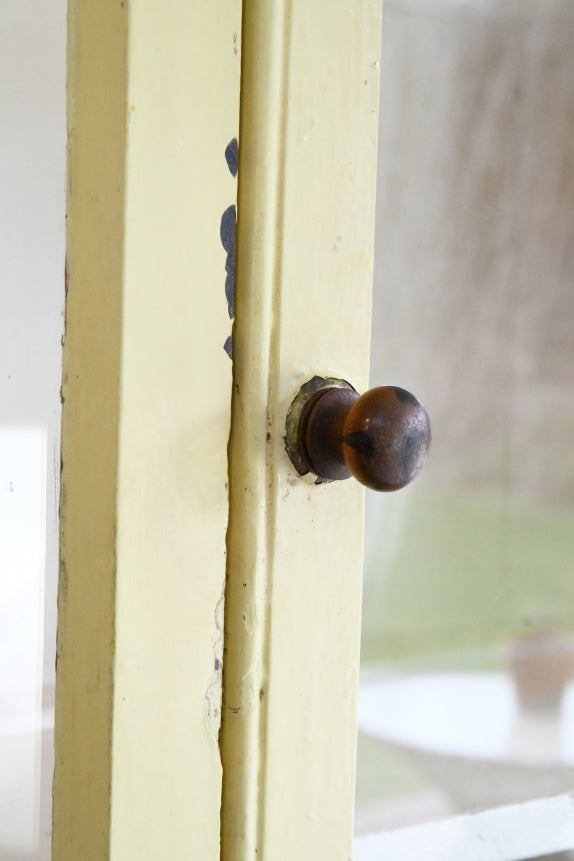 Antique Victorian Painted Pine Dresser. Victorian painted pine dresser base with glazed display top, of traditional country form. The upper section is fitted with a pair of glazed doors enclosing open shelving, above a base with two drawers over two panelled cupboard doors. Finished in an attractive pale yellow paint with pleasing wear and patina, and retaining a contrasting wooden top. A practical and decorative piece, ideal for kitchen storage, a dining room display cabinet, or pantry cupboard.