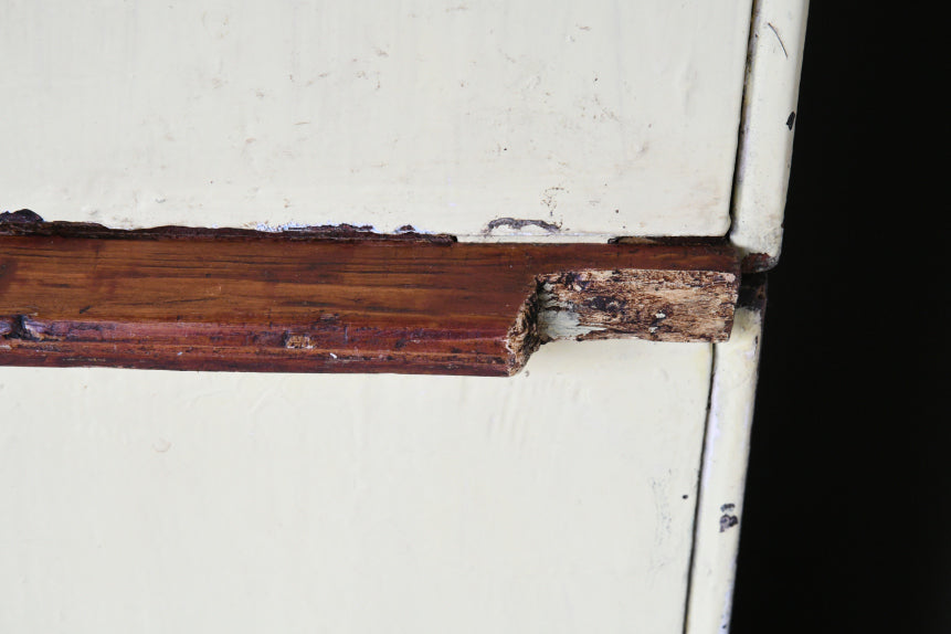 Condition: Cut to the side of the cornice, as well as to the base and plinth at the bottom. Repair to rear legs. Numerous chips and losses to the painted finish throughout, consistent with age and use.