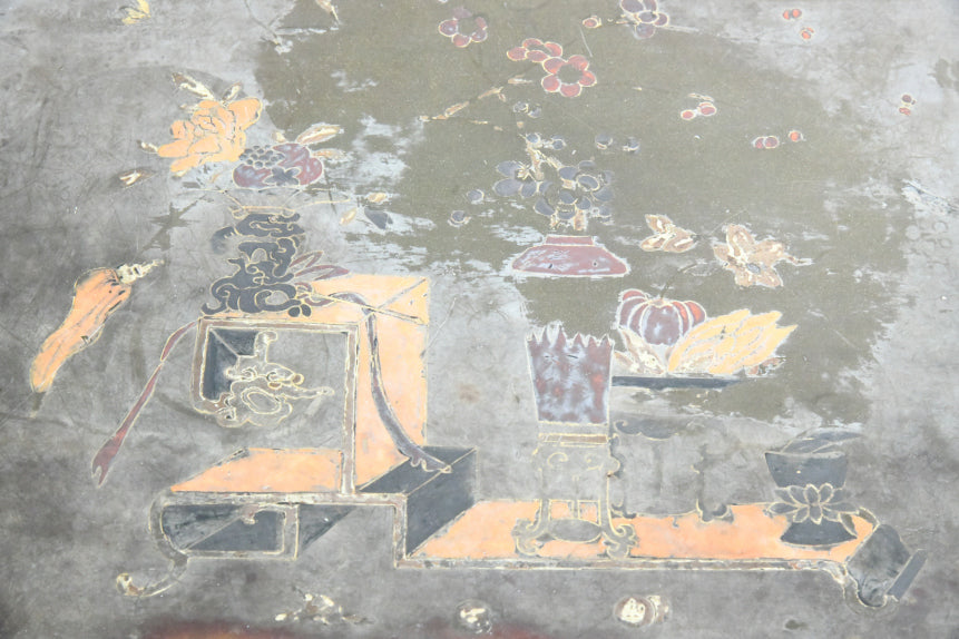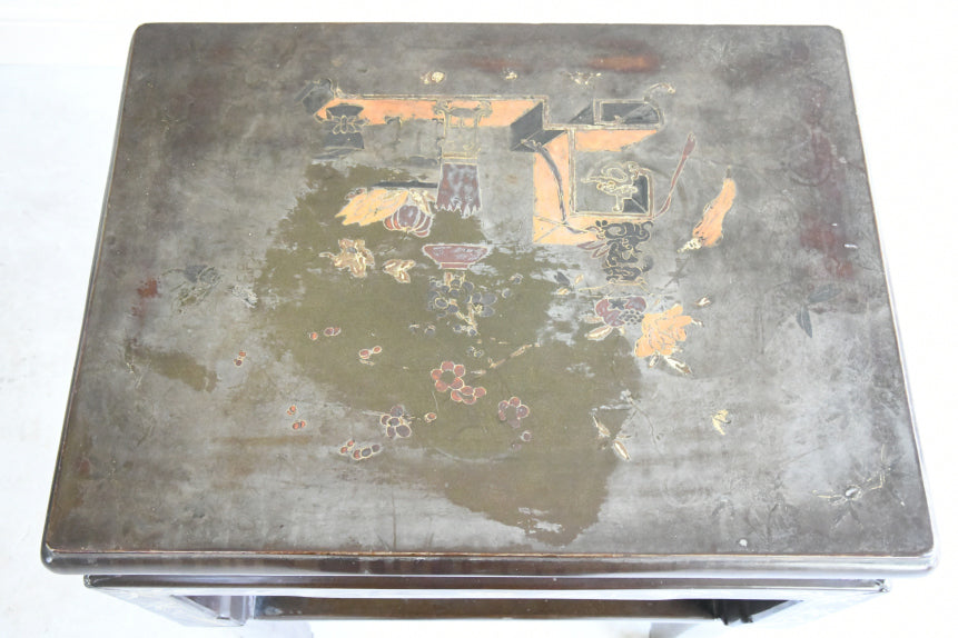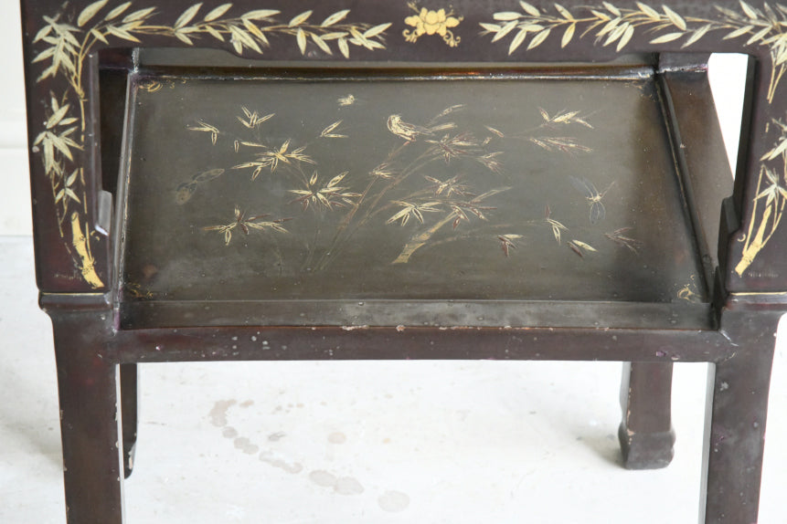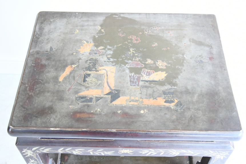 Chinese Plant Stand. Decortive late 19th century Chinese hardwood plant stand, finished in a rich dark lacquer. The square top with stylised arrangement of vessels, floral sprays, and symbolic objects , decorative frieze featuring delicate gilt bamboo and foliate decoration . The stand is raised on four square-section legs, joined by a lower tier for additional display.
