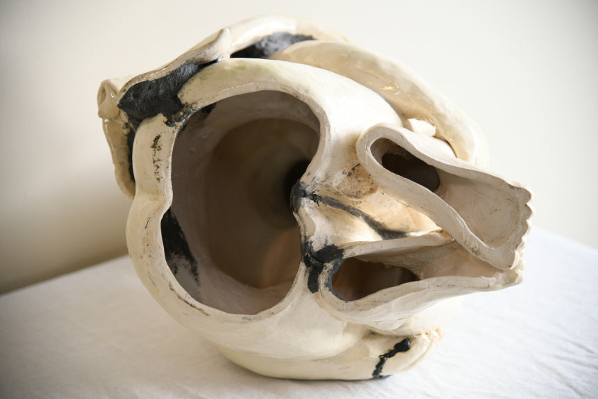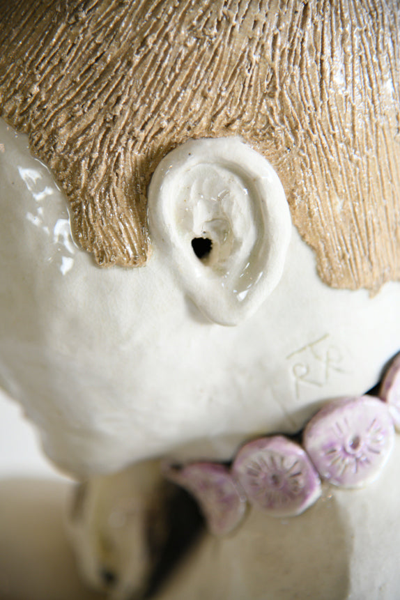 Large Studio Pottery Seated Figure. A large late 20th century studio pottery figure by Richard Tindale, depicting a seated female with knees drawn up in a thoughtful pose. The figure is simply modelled with expressive facial detail and textured hair, giving it strong character and presence. Finished in a glossy pale glaze with subtle painted accents. A striking decorative piece of contemporary British studio pottery, ideal as a focal point in a modern interior or ceramic collection.