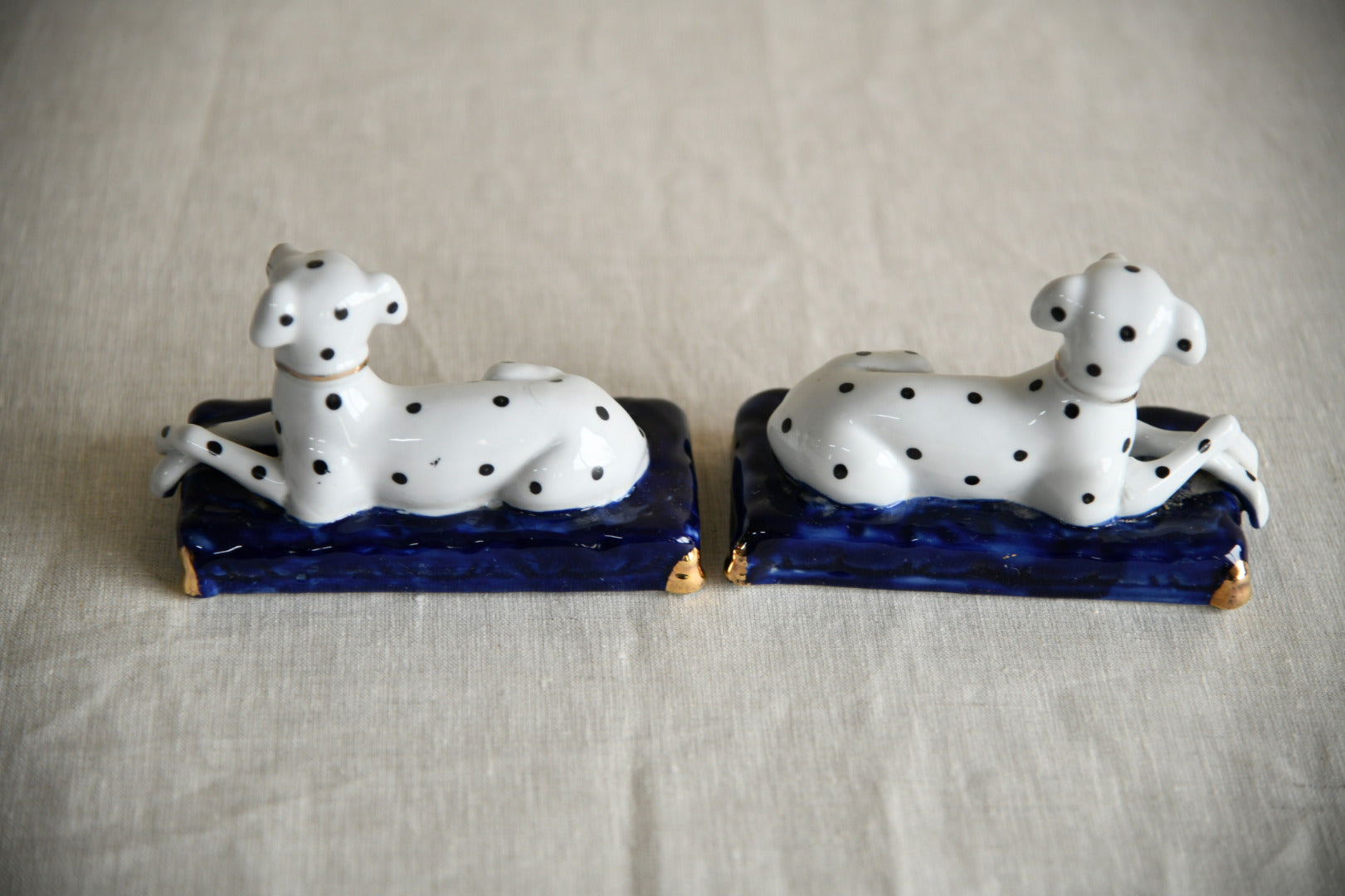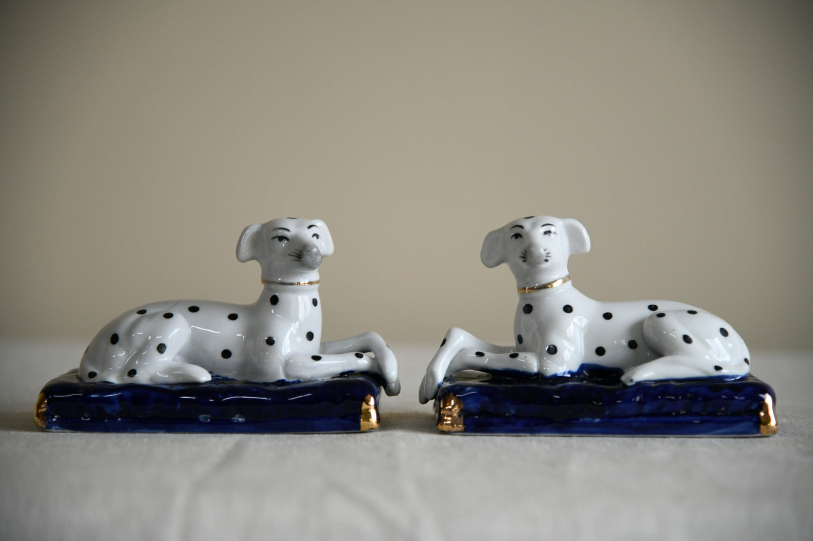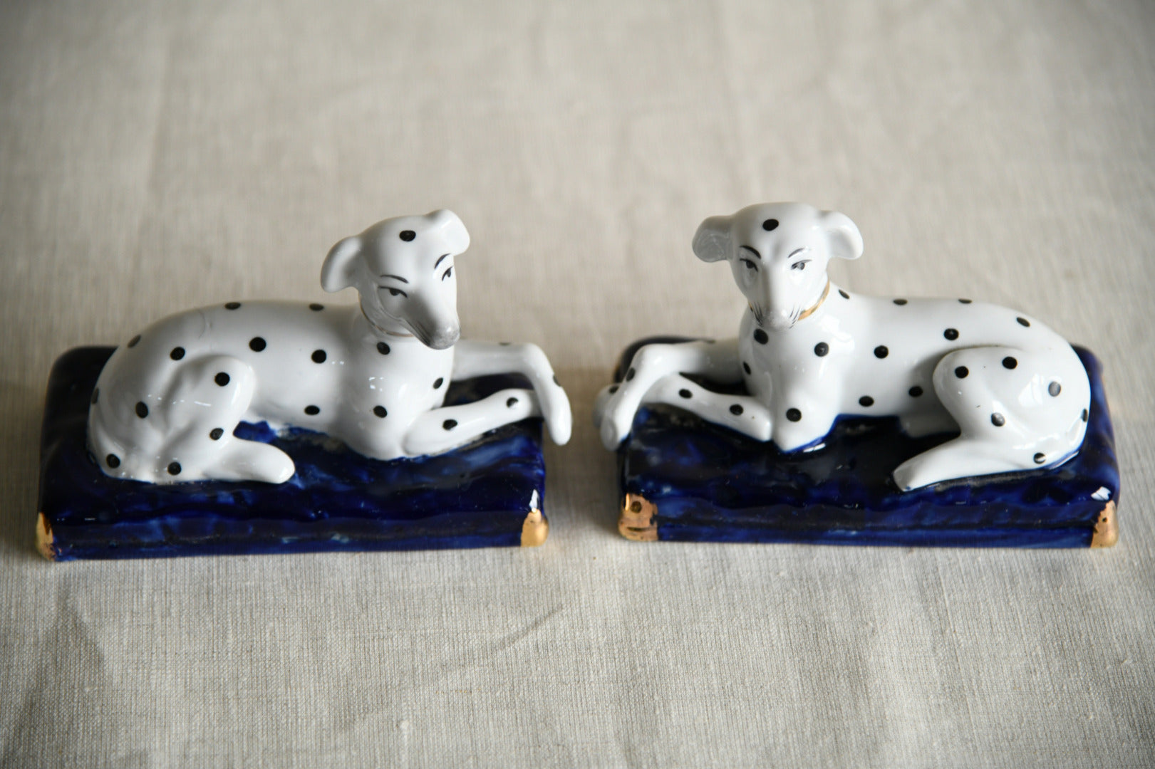 Pair Staffordshire Style Dalmations. Pair 20th Century decorative ceramic Dalmatian dog figures in the traditional Staffordshire style, modelled recumbent and set upon deep cobalt blue bases with gilt highlights. Each dog is finished in a glossy white glaze and hand-decorated with black spots, picked out facial features and a fine gilt collar, capturing the whimsical character typical of 19th-century Staffordshire flatback figures.