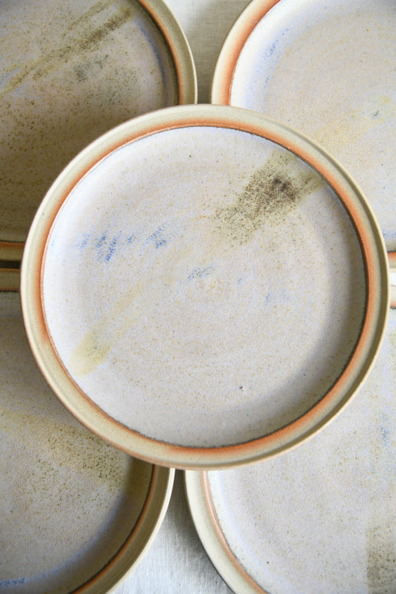 5 John Buchanan Anchor Pottery Dinner Plates. A set of five hand-thrown dinner plates by John Buchanan of Anchor Studio, Porthleven, Cornwall. Each plate features a simple, well-proportioned form with a gently raised rim and a soft, natural glaze in muted stone and earthy tones. Durable and timeless in design, they are ideal for everyday use or display.
