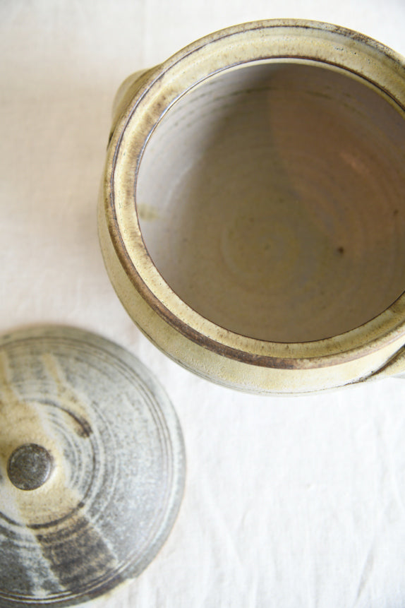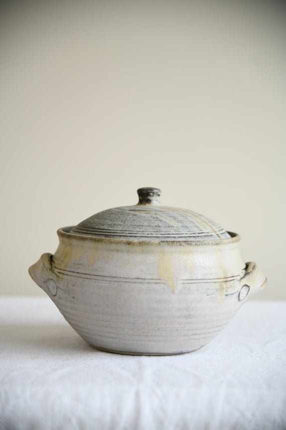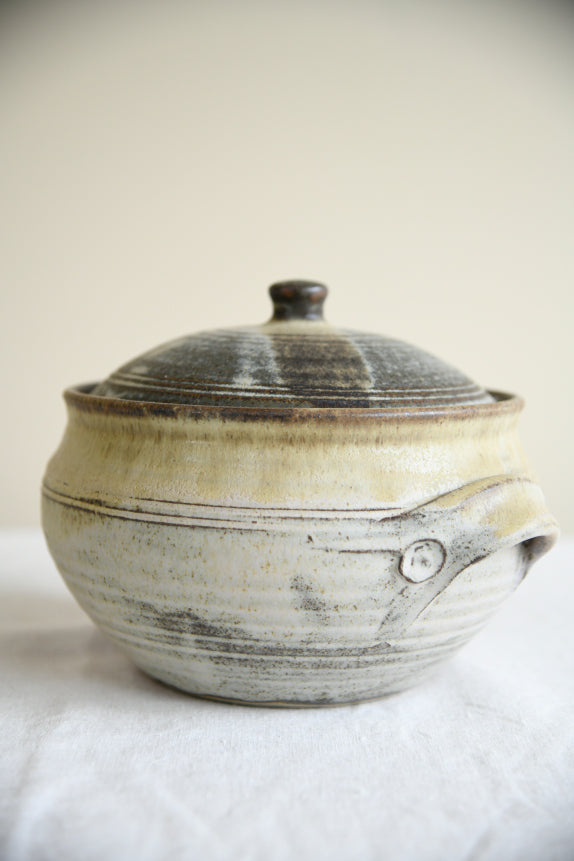 John Buchanan Anchor Pottery Tureen. A hand-thrown studio pottery lidded pot by John Buchanan of Anchor Studio, Porthleven, Cornwall. The piece features a gently rounded body with incised linear decoration and a simple arched motif to the front. Finished in soft, natural glazes of warm cream and muted earthy tones with darker shading to the lid. Both decorative and practical, this versatile pot is ideal for storage or display and represents a fine example of contemporary Anchor Studio craftsmanship.