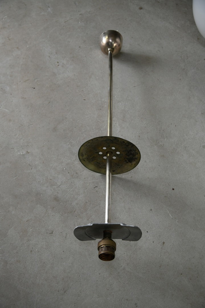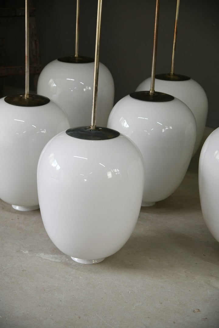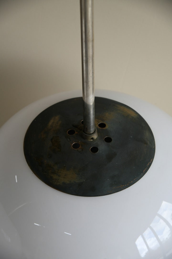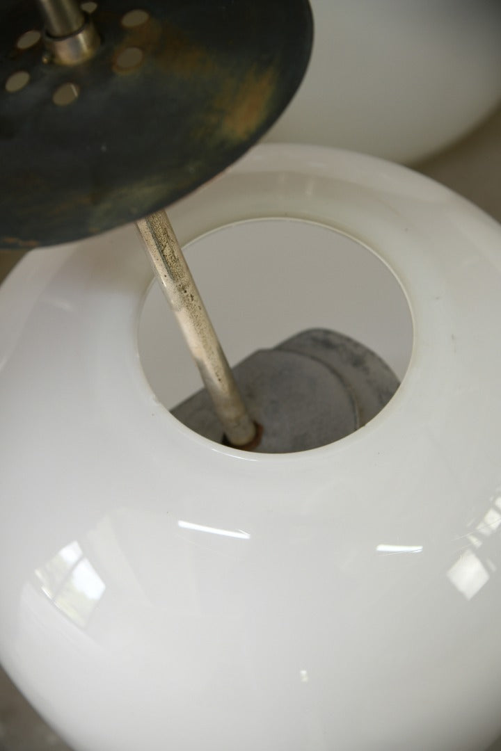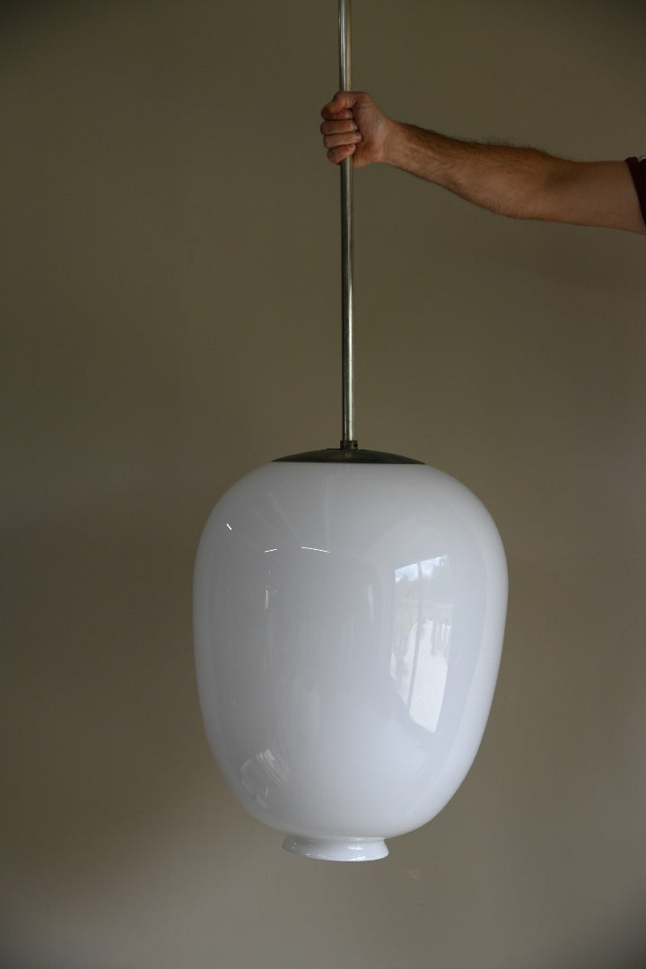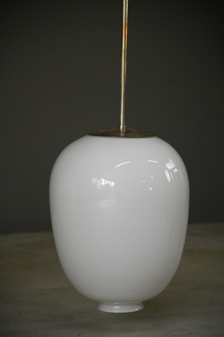 Single Mid Century Murano Stilnovo Style Pendant Lamp. Single Mid Century large ceiling pendant, chromed copper ceiling rose with stright hanging bar and gallery, large white glass shade. Original vintage bulb holder which takes a large Eddison type bulb, this can be replaced if preferred. I have 7 lamps available.