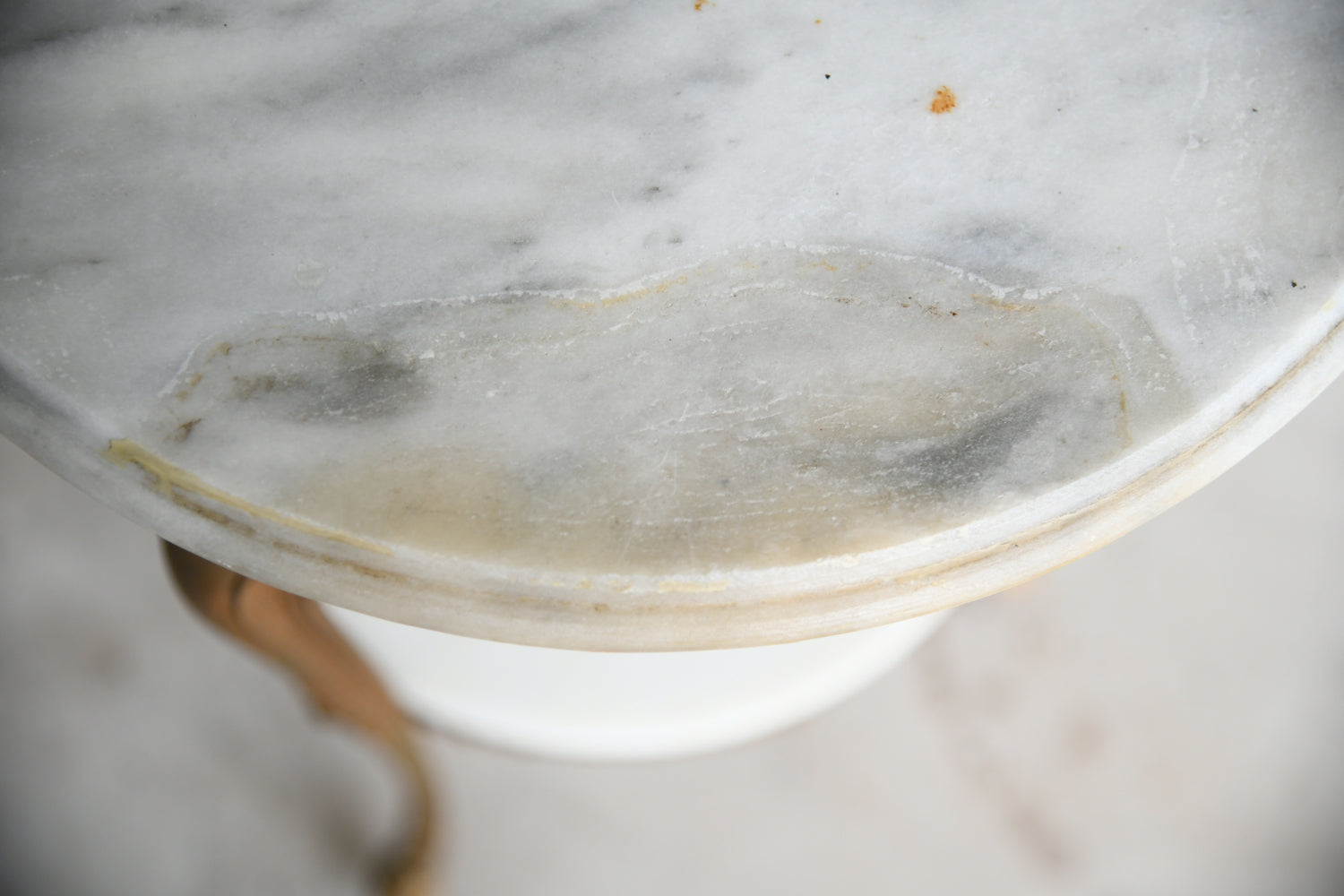 Vintage Louis XV Style Occasional Table. Mid 20th Century Decorative Louis XV style two-tier occasional table with white marble top and lower shelf. Painted cast metal frame with scrolling and shell detail in the Rococo manner on cabriole legs. This piece works well as a side table, lamp table or display stand.