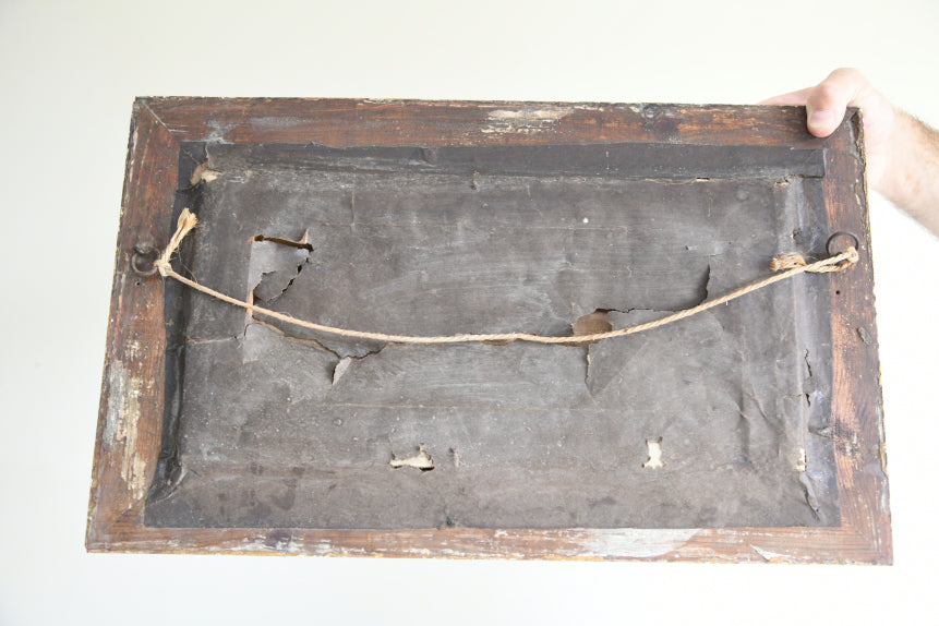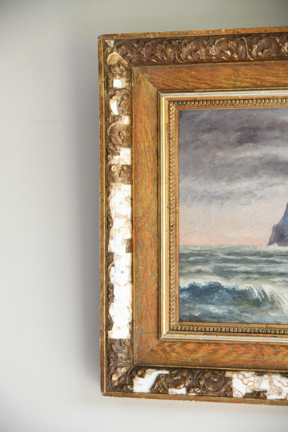 Antique Coastal Oil On Canvas. Atmospheric coastal oil painting, depicting waves breaking against rugged cliffs beneath a dramatic sky. The composition captures the movement of the sea and the contrast between dark rock formations and lighter distant headlands. Painted with expressive brushwork and a moody palette, the work conveys the power and character of a wild shoreline.Presented in an ornate gilt frame. Indistinctly signed lower right.