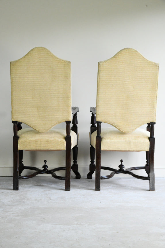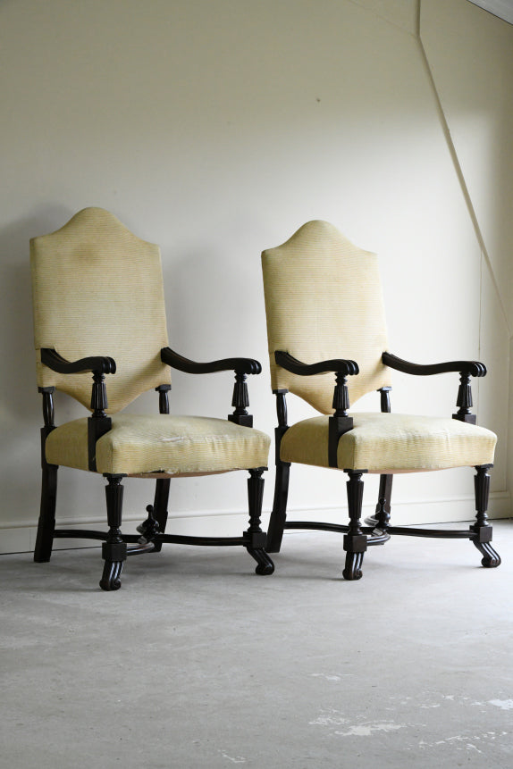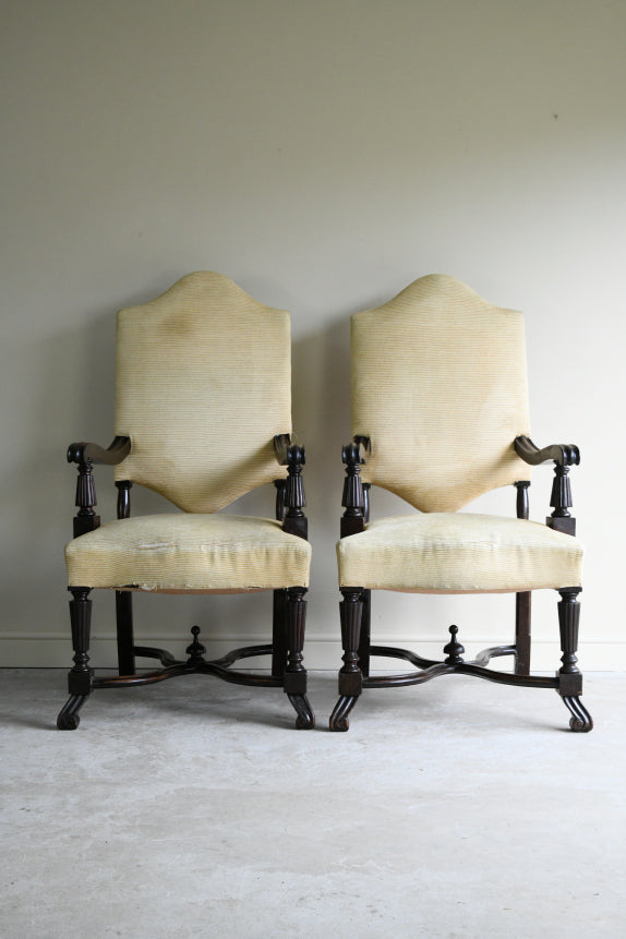 Pair French Mahogany Armchairs. Pair of French open arm chairs with mahogany frames, The softly shaped backs and sprung seats, with carved supports. An elegant and versatile pair, suitable for a dining room, bedroom, or sitting room.