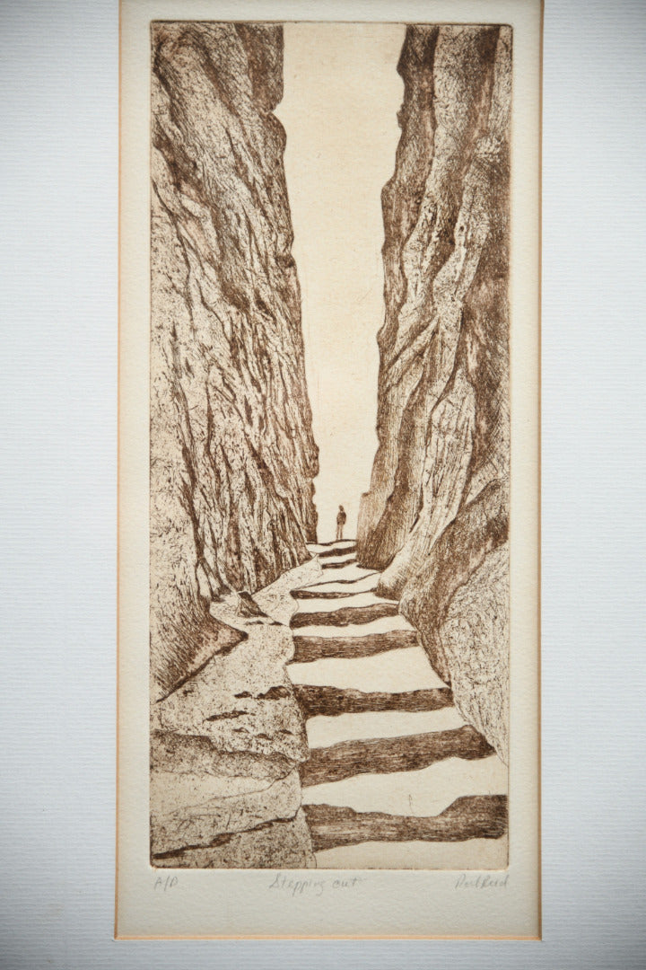 Pat Reid - Stepping Out Etching. Late 20th Century artists proof etching. Depicting a stepped pathway between dramatic rock formations, with a small distant figure adding depth to the scene.
