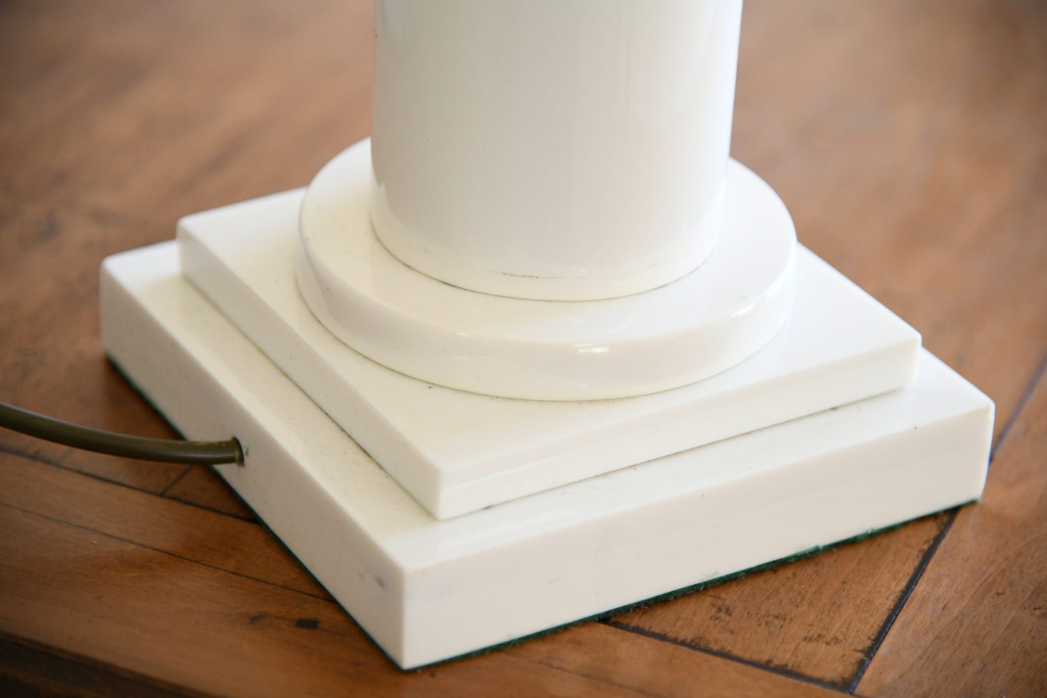 Stained Glass Table Lamp. Late 20th Century lamp with a faceted leaded glass shade, incorporating iridescent and tinted panels with a scalloped lower border, raised on a cylindrical acrylic base and square plinth, single standard bayonet bulb holder.