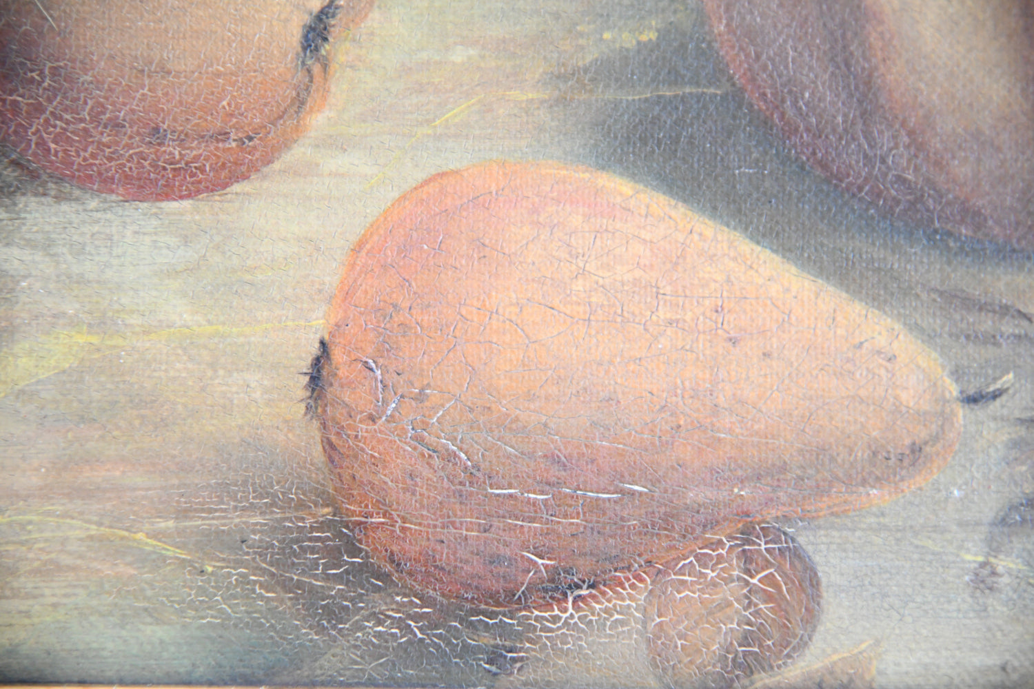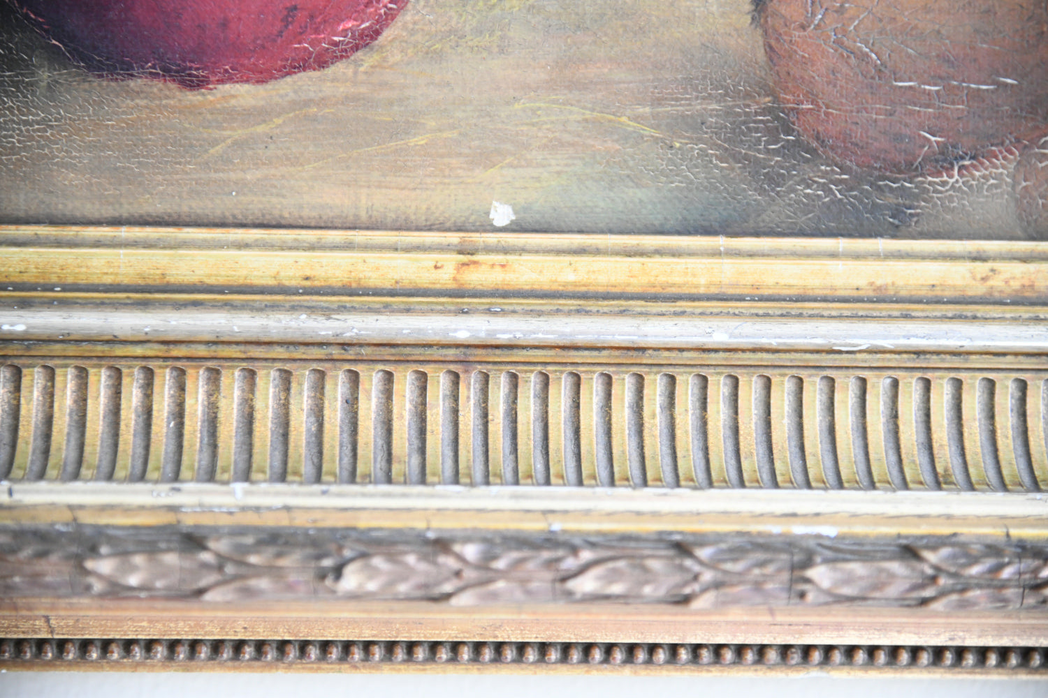 Decorative Still Life - Fruit & Pumpkin. Early - Mid 20th Century Decorative still life oil painting depicting a group of fruit and a pumpkin arranged on a table. The composition includes apples, pears and a basket of fruit, set beside a pumpkin, rendered in warm autumnal tones against a soft background. The painting is presented in a traditional gilt moulded frame with fluted and beaded detail, complementing the classical style of the composition. An attractive and decorative piece of wall art, well suited to a dining room, kitchen, or living space.