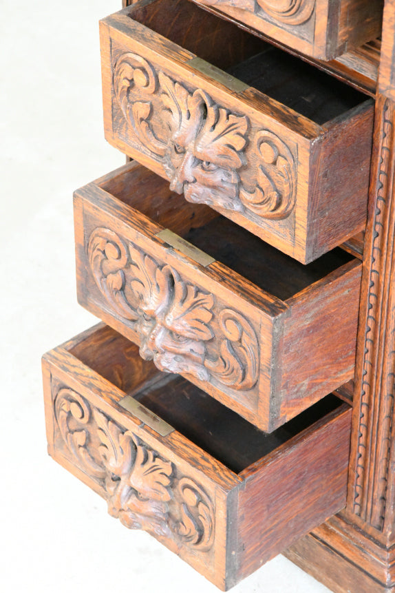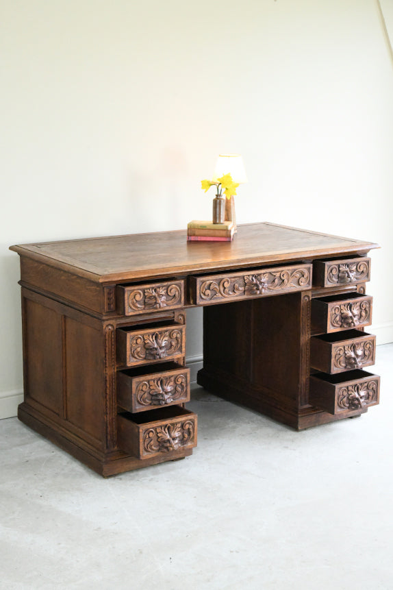 Antique Victorian Carved Oak Greenman Desk. Good quality carved oak pedestal desk. The long rectangular top sits above a deep frieze drawer, flanked by carved panels with scrolling foliage and stylised greenmanmask motifs. Each pedestal is fitted with a graduated arrangement of drawers, all with bold carved fronts and greenman handles.The desk is of strong architectural form, standing on plinth bases, and retains a warm, well-aged patina throughout. A striking and practical antique desk, offering excellent storage and an impressive presence, ideal for a study or library interior.