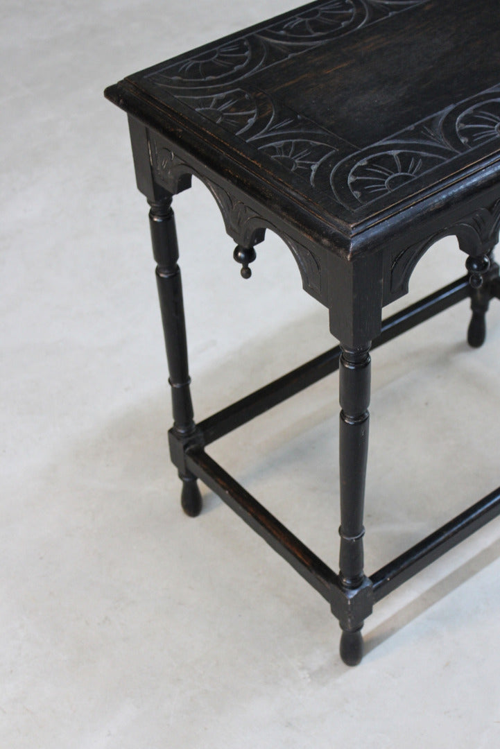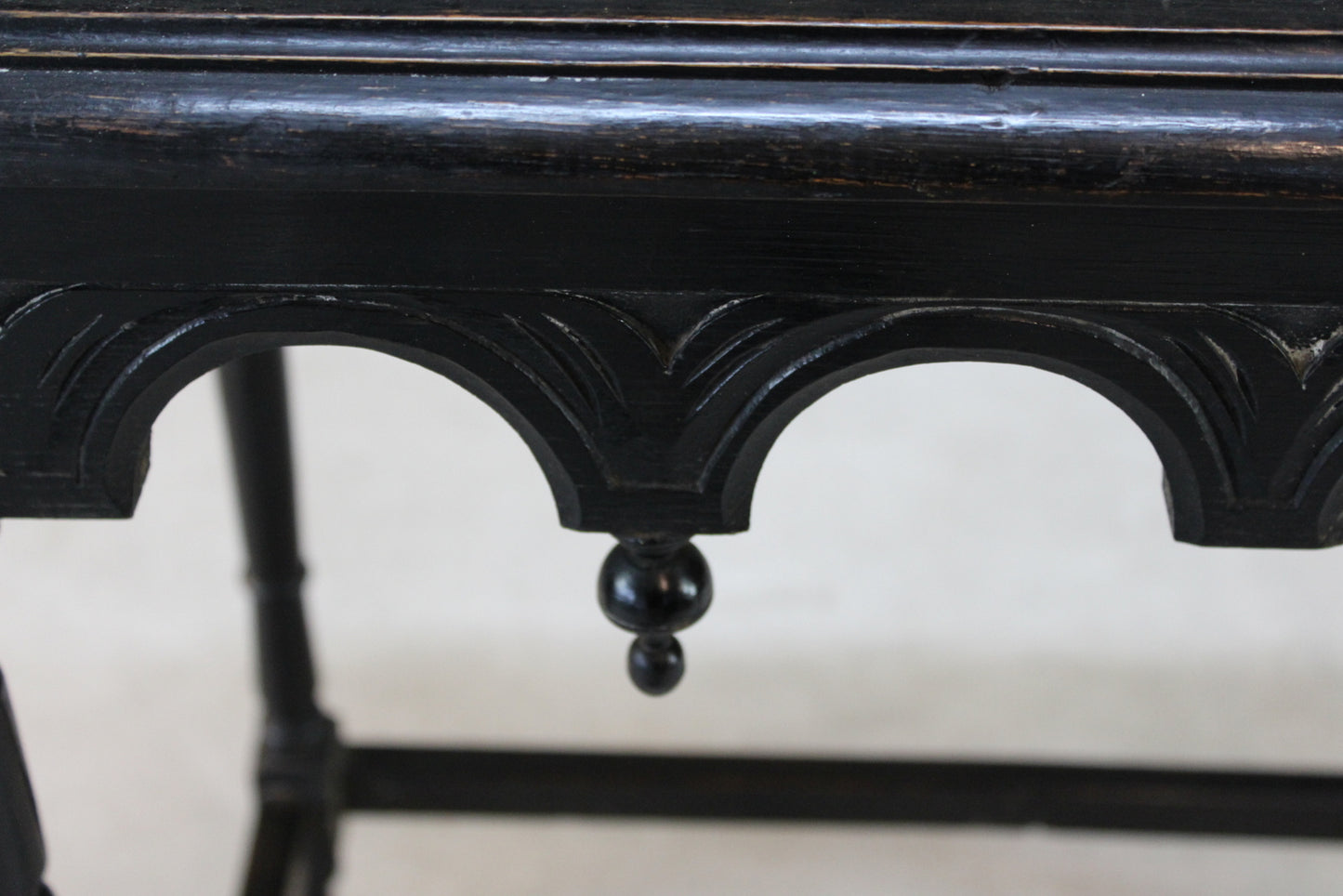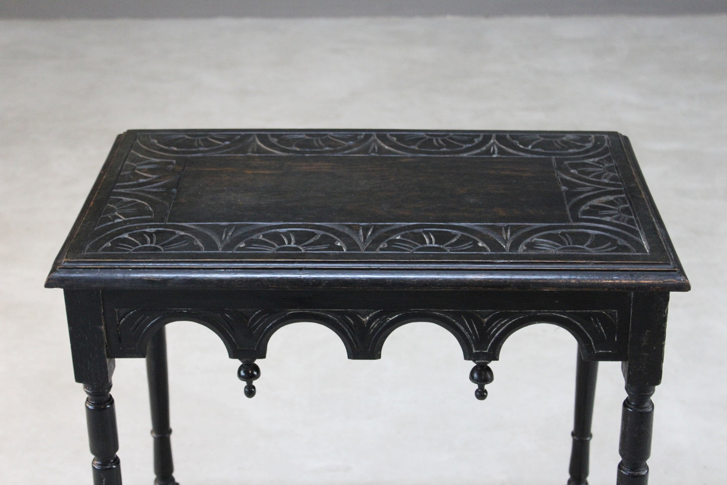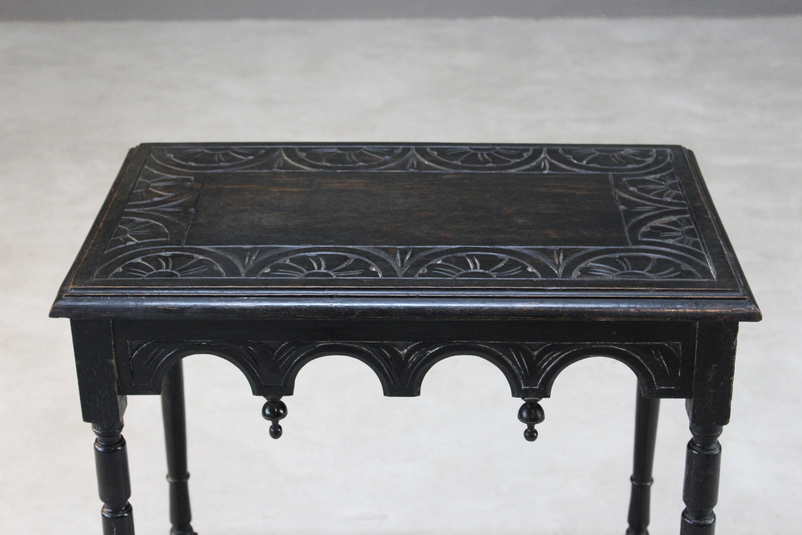 Victorian ebonised oak side table. Antique side table, ebonised oak with carved decoration to the top and carved drop finial frieze.