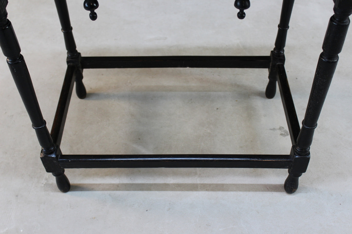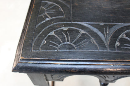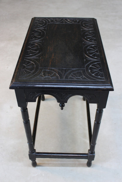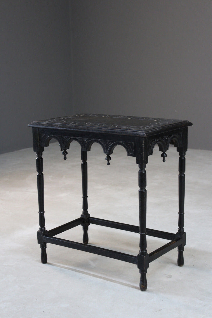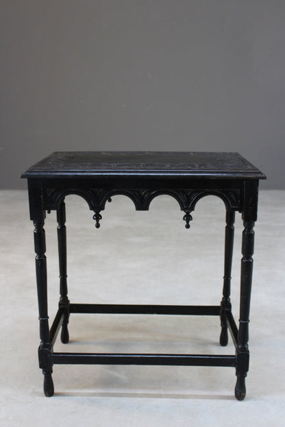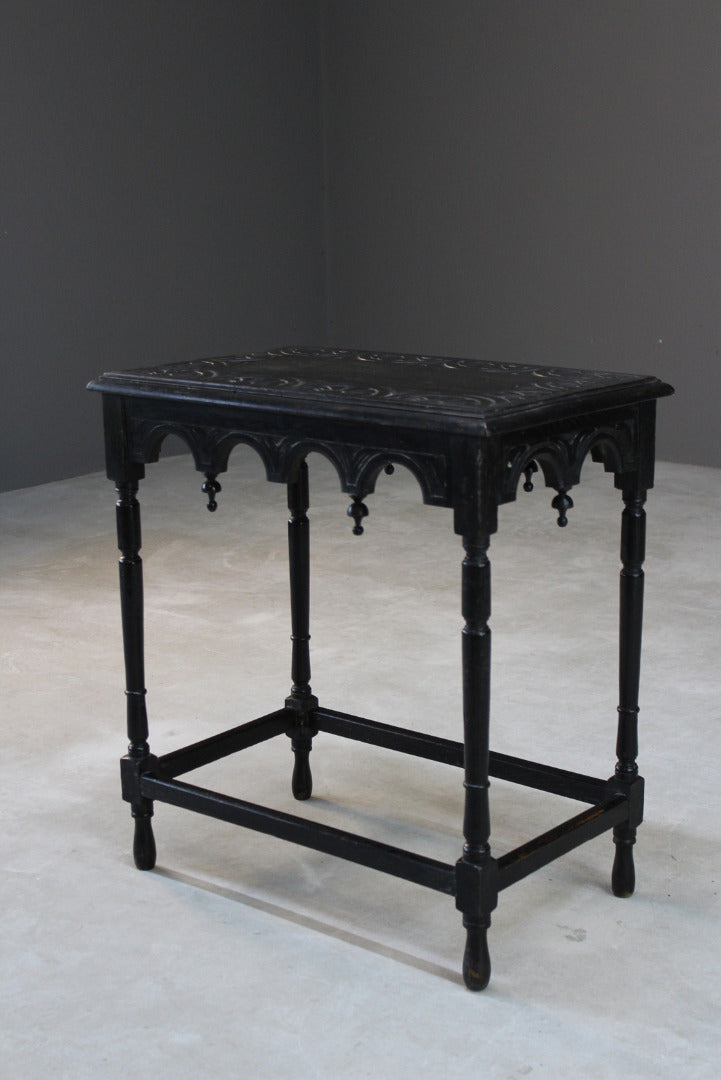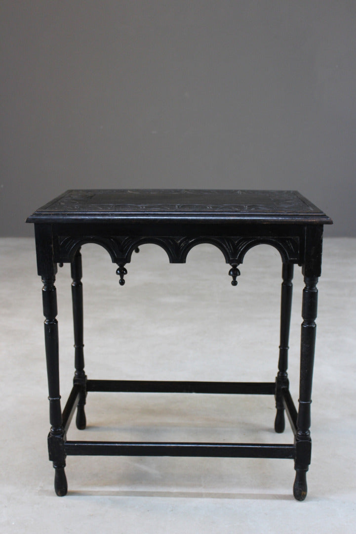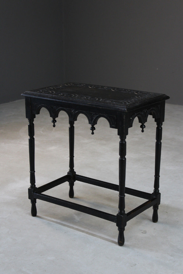 Victorian ebonised oak side table. Antique side table, ebonised oak with carved decoration to the top and carved drop finial frieze.