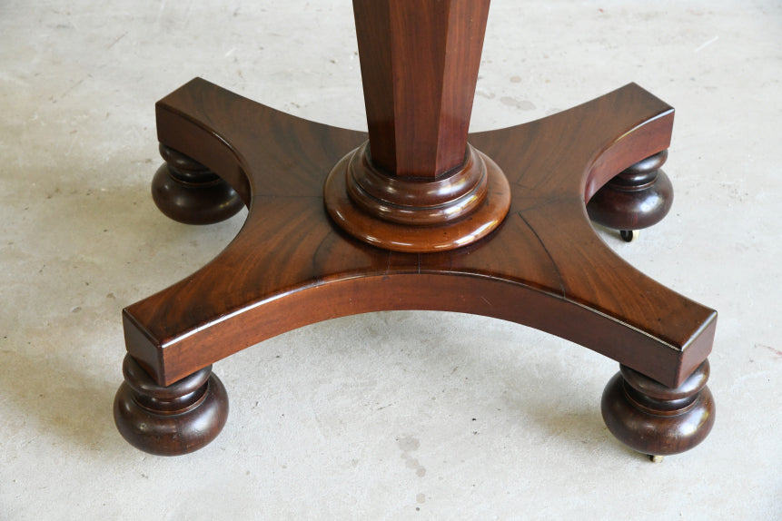 Antique Mahogany Tea Table. Antique Victorian tea table, the turnover top on faceted stem and quadraform plateau base and four small bun feet