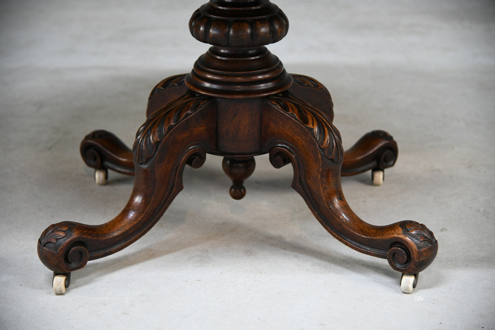 Antique Victorian Burr Walnut Tilt Top Table. Victorian burr walnut veneered oval tilt-top breakfast table upon turned and fluted pedestal with four outswept feet with leaf carved knees and on ceramic castors.