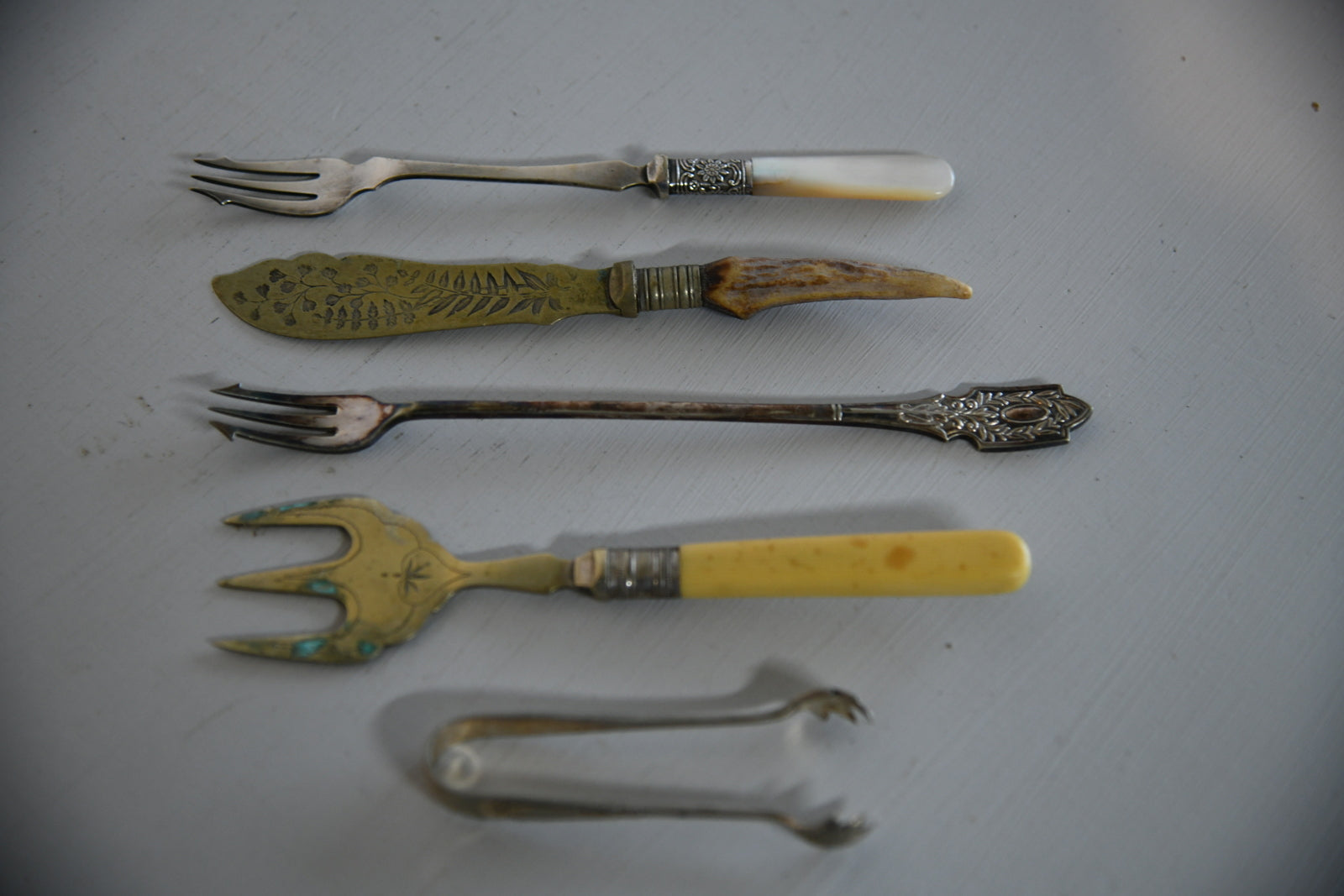 Collection Vintage Cutlery, includes 3 forks, 1 knife & sugar tongs