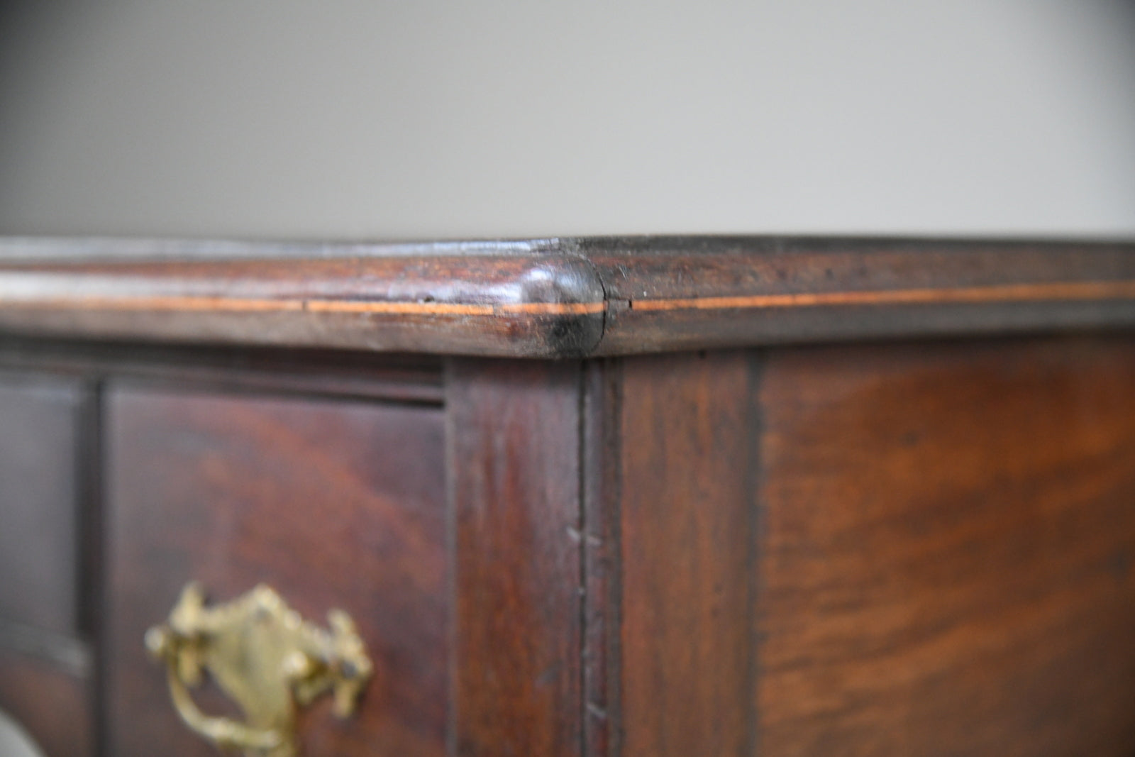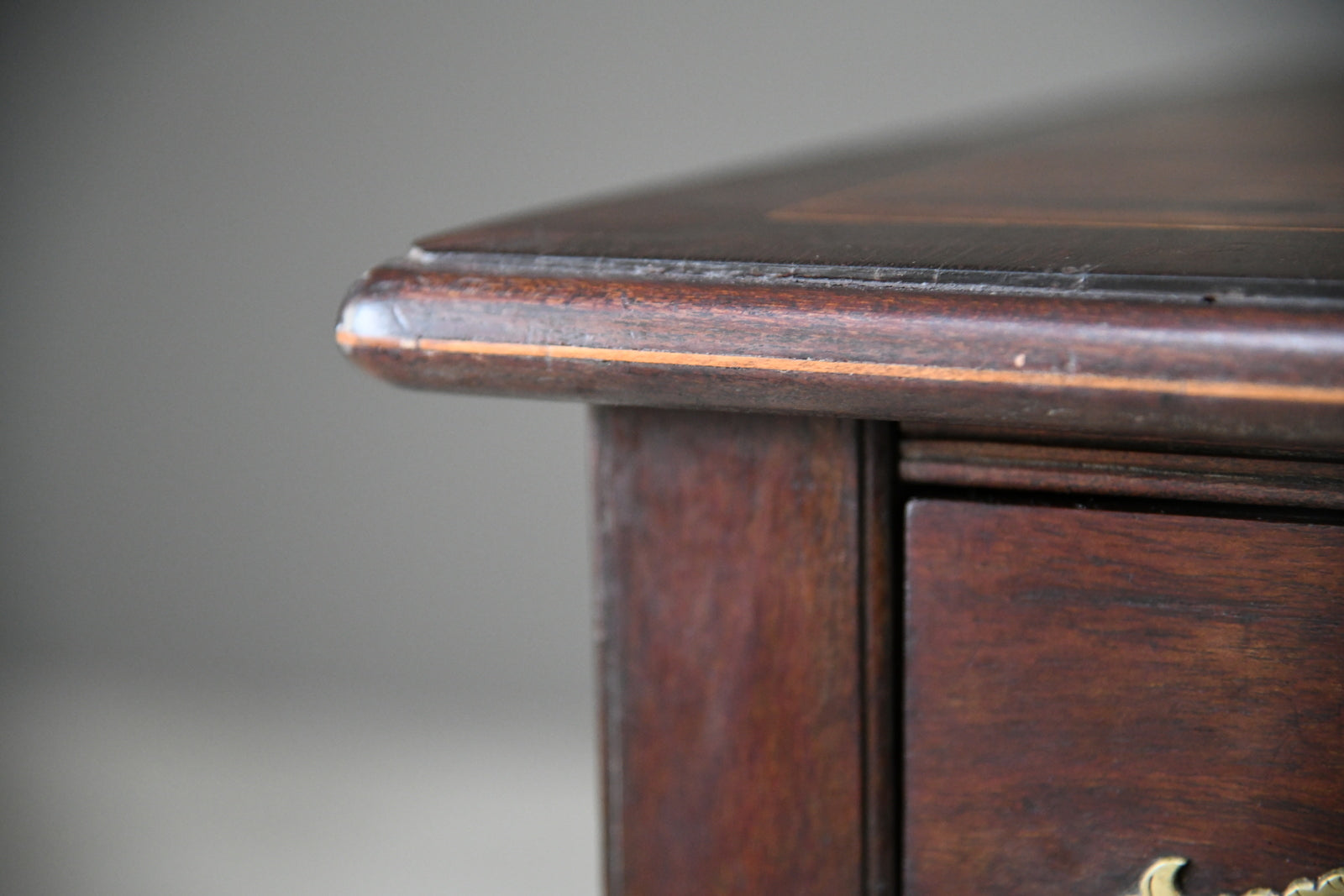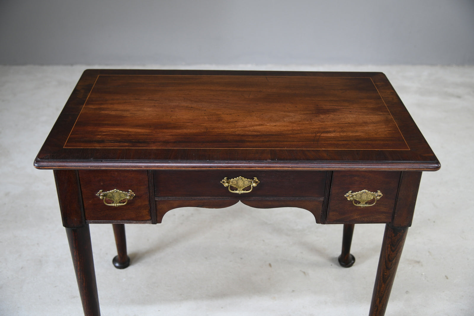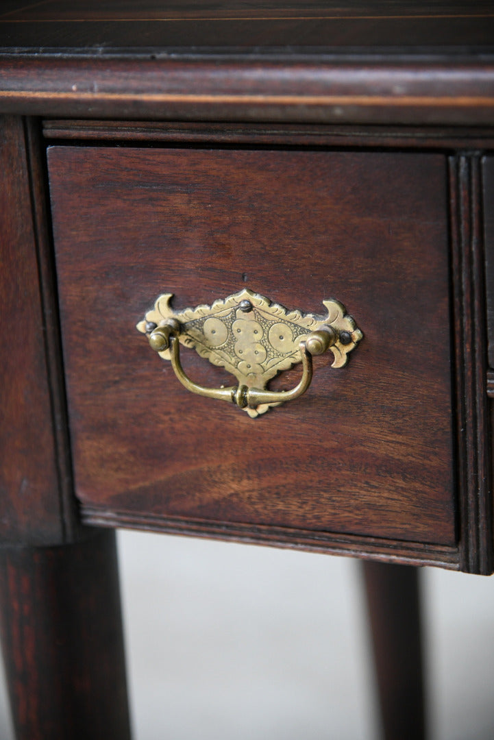 Georgian Style Low Boy. Georgian style low boy moulded top with box wood inlay over three drawers fitted with etched brass plate handles. Shaped apron below and raised on turned oak legs terminating in pad feet.