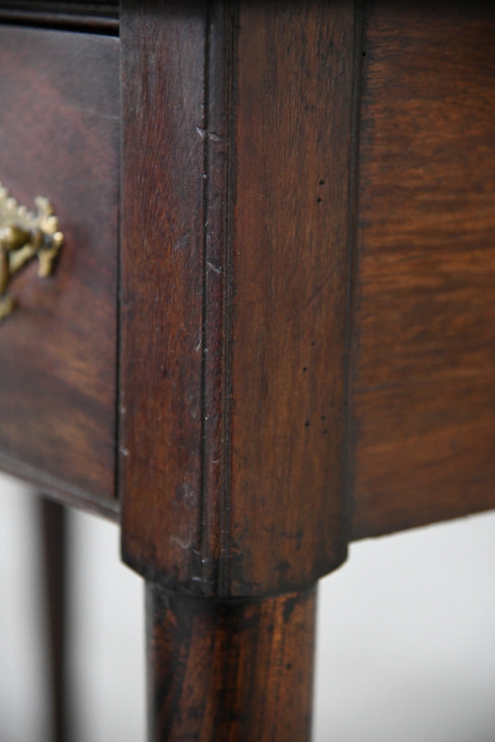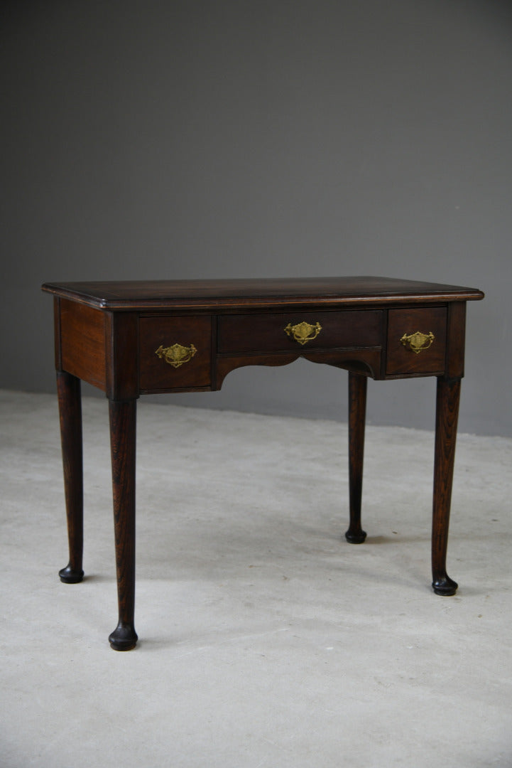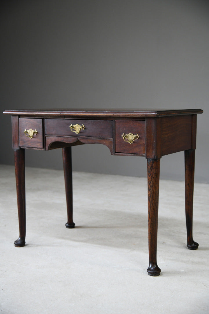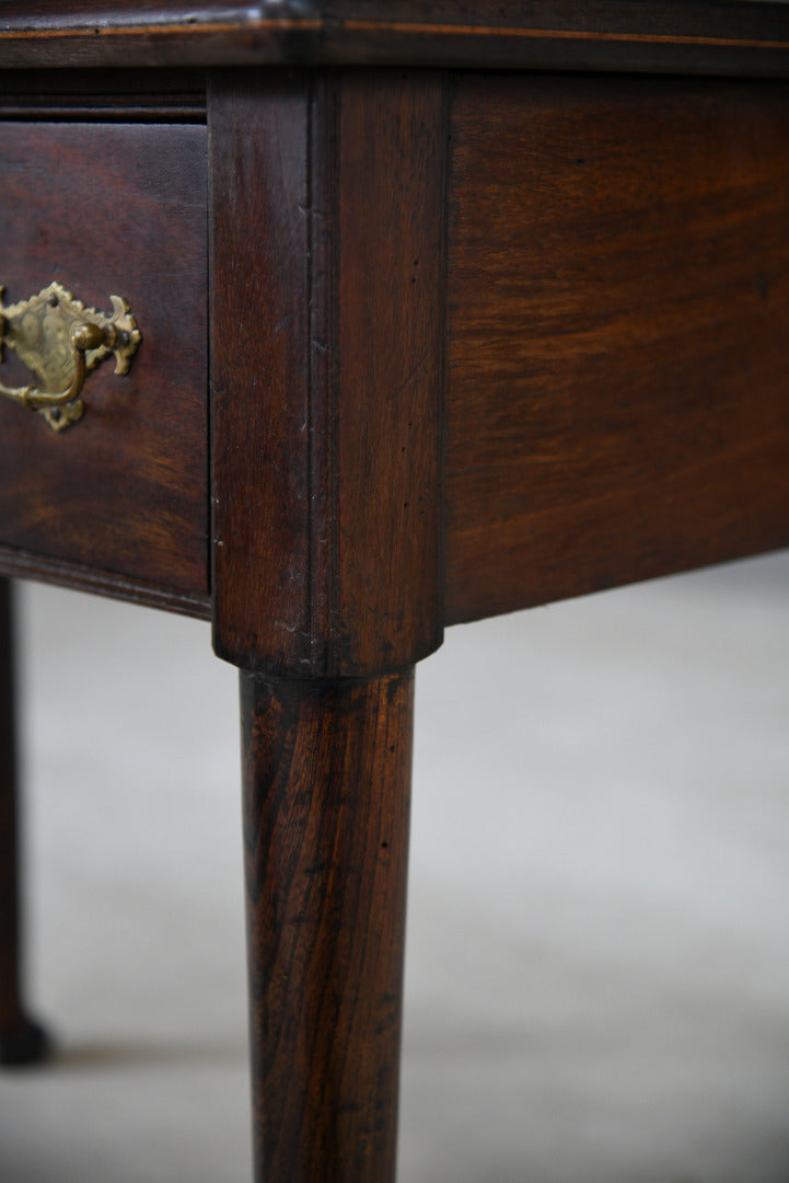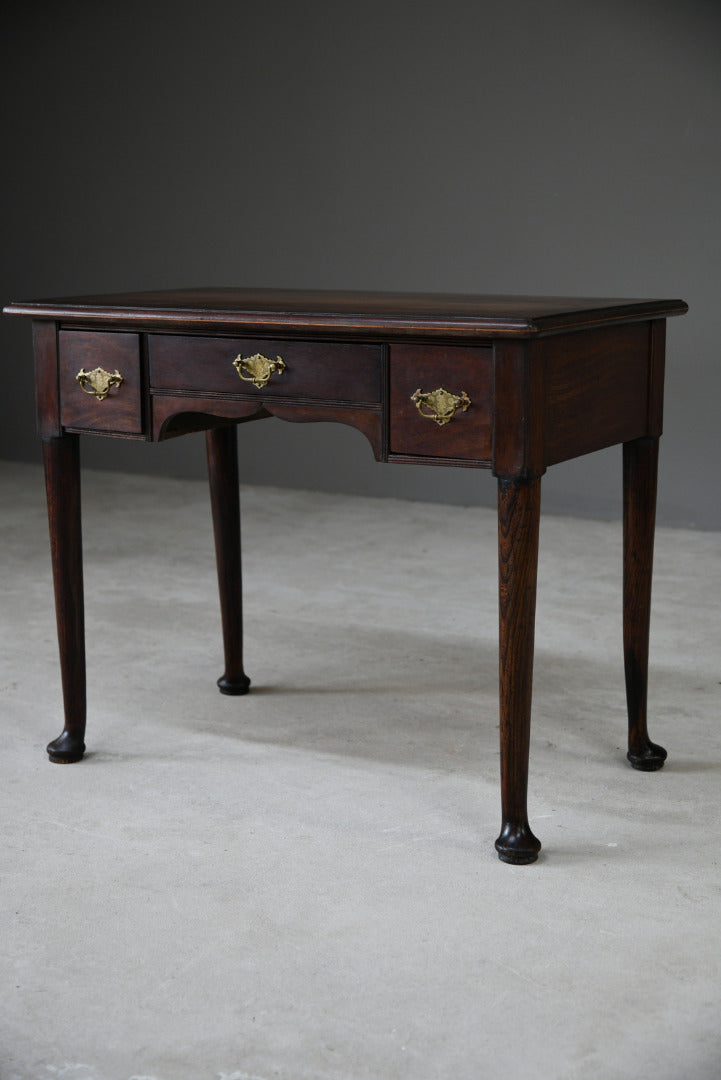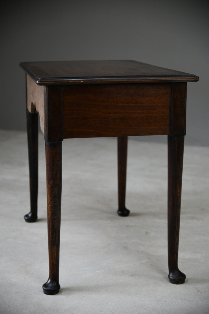 Georgian Style Low Boy. Georgian style low boy moulded top with box wood inlay over three drawers fitted with etched brass plate handles. Shaped apron below and raised on turned oak legs terminating in pad feet.