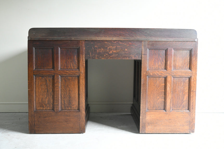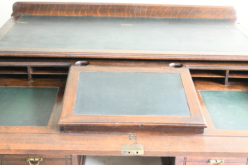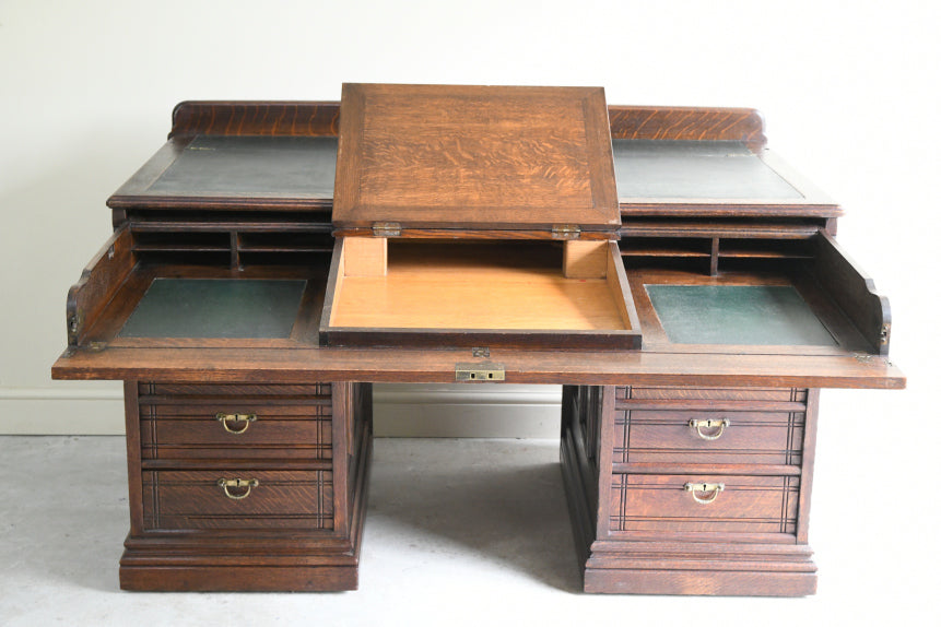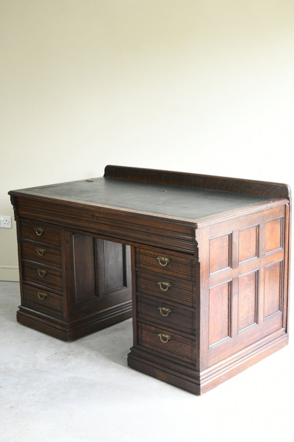 Large Victorian Antique Oak Desk. Large Victorian oak twin pedestal desk, the hinged top with lower tier and pull out writing slope on pair of pedestals each with four drawers on plinth base and concealed castors