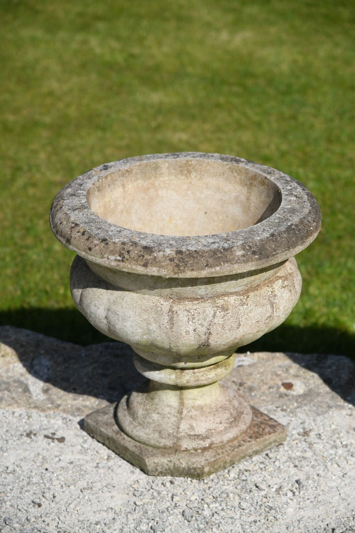 Pair Composite Stone Garden Urns. Late 20th Century composite stone round garden urns on square base