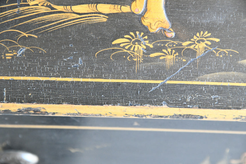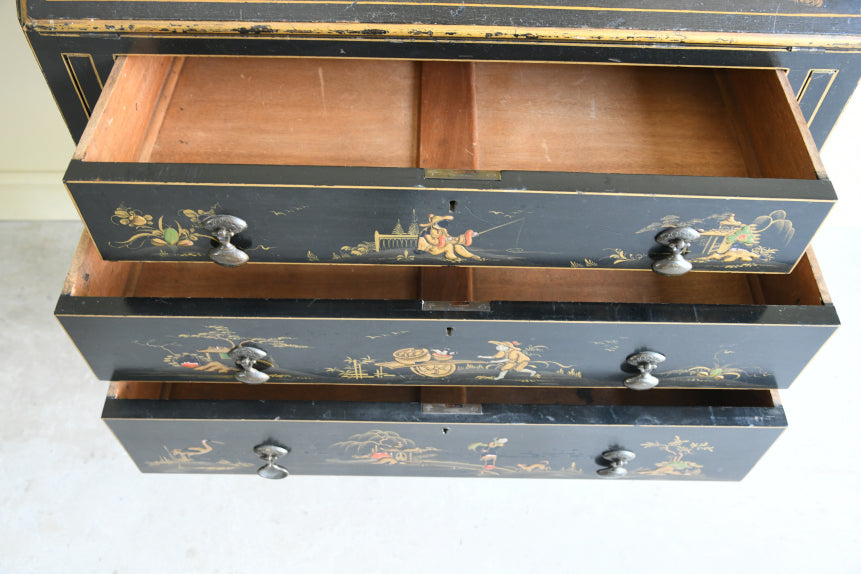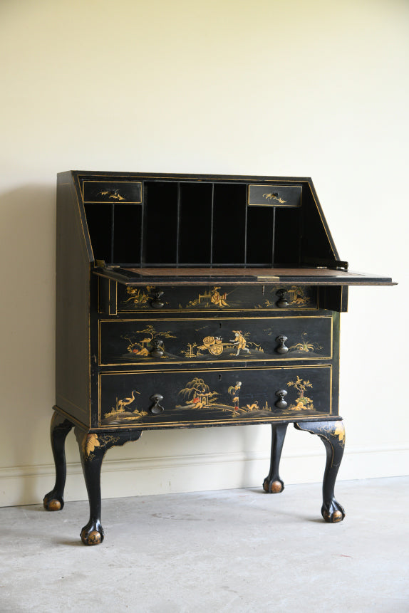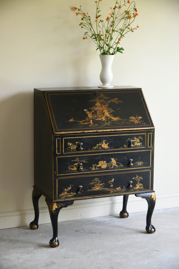 Vintage Chinoiserie Writing Bureau. Mid 20th Century vintge black japanned writing bureau, black lacquer finish with oriental scenes, fall front with fitted interior above three long drawers on cabriole legs.