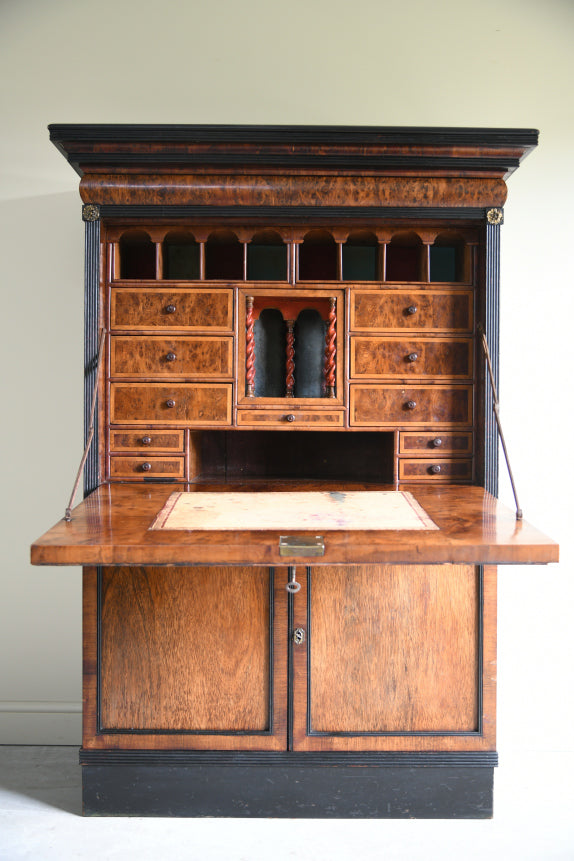 Antique Yew Wood Escritoire. Antique 18th Century & later escritoire, the moulded ebonised cornice with yew veneer fall front, the interior fitted with arcaded pigeon holes with arrangement of small drawers and central mirrored recess with secret drawers and compartments, later base with pair of doors and single cupboard below on ebonised plinth base.