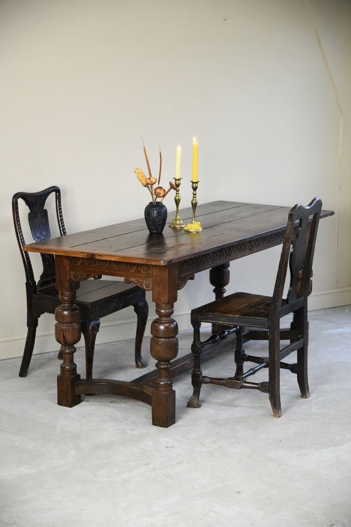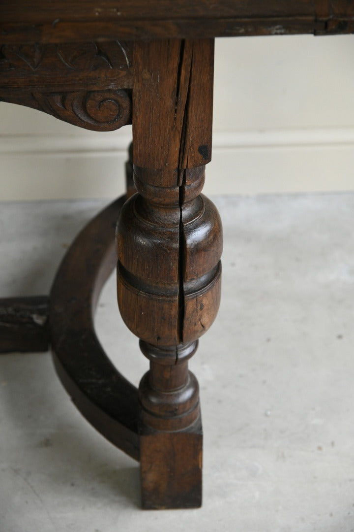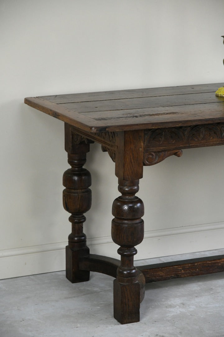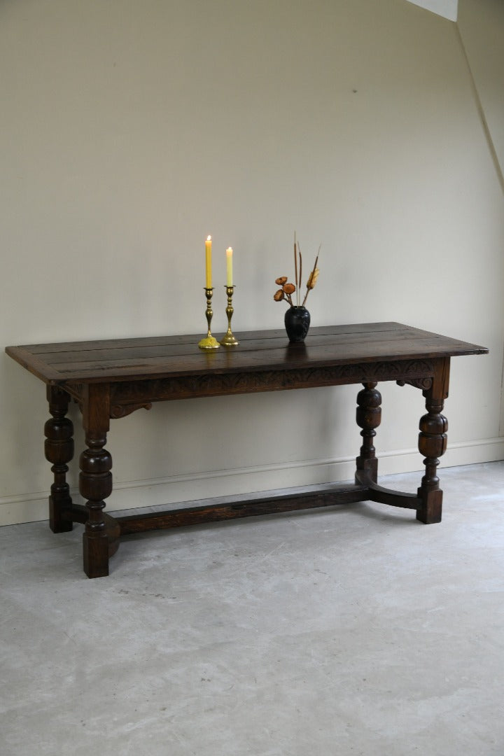 17th Century Style Refectory Table. Large oak rectangular refectory dining table with planked top and cleated ends, carved lunette frieze on cup and cover supports joined by central stretcher.