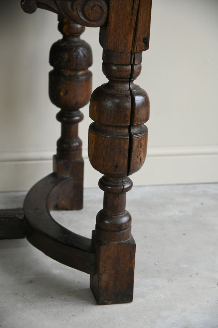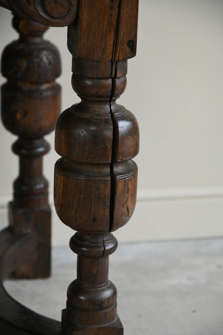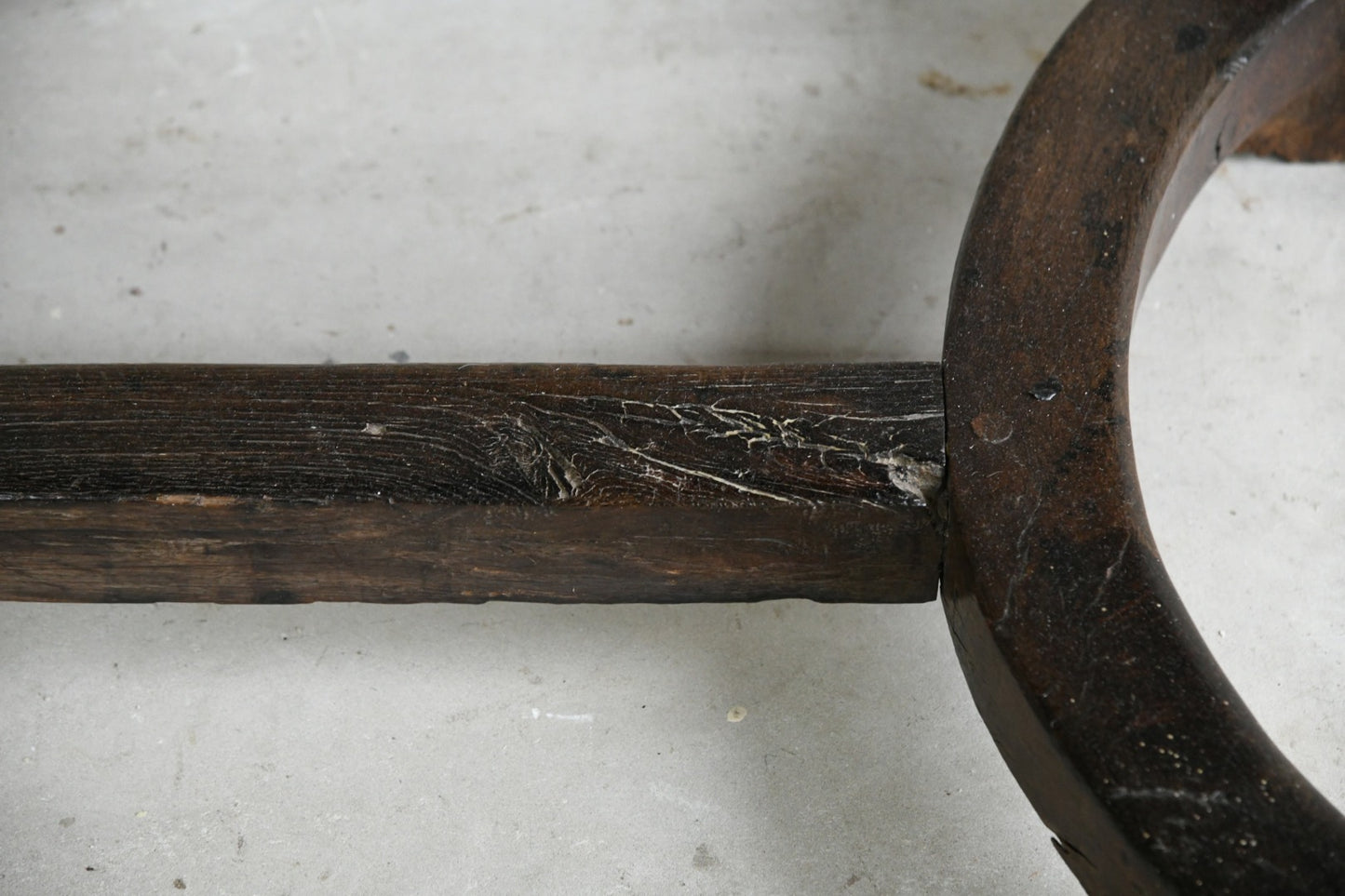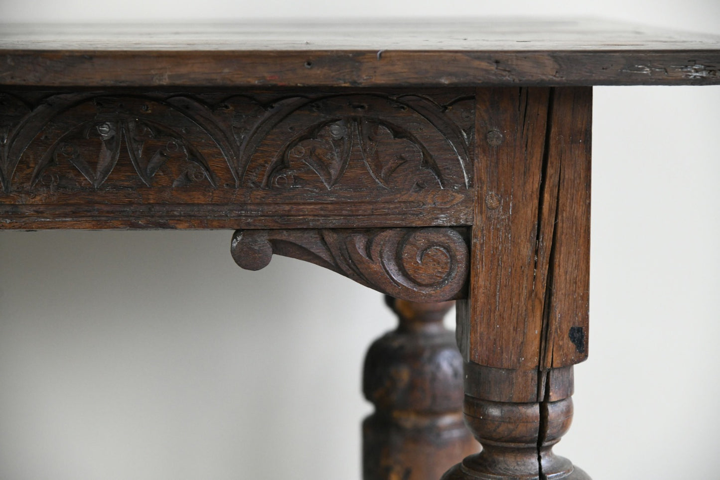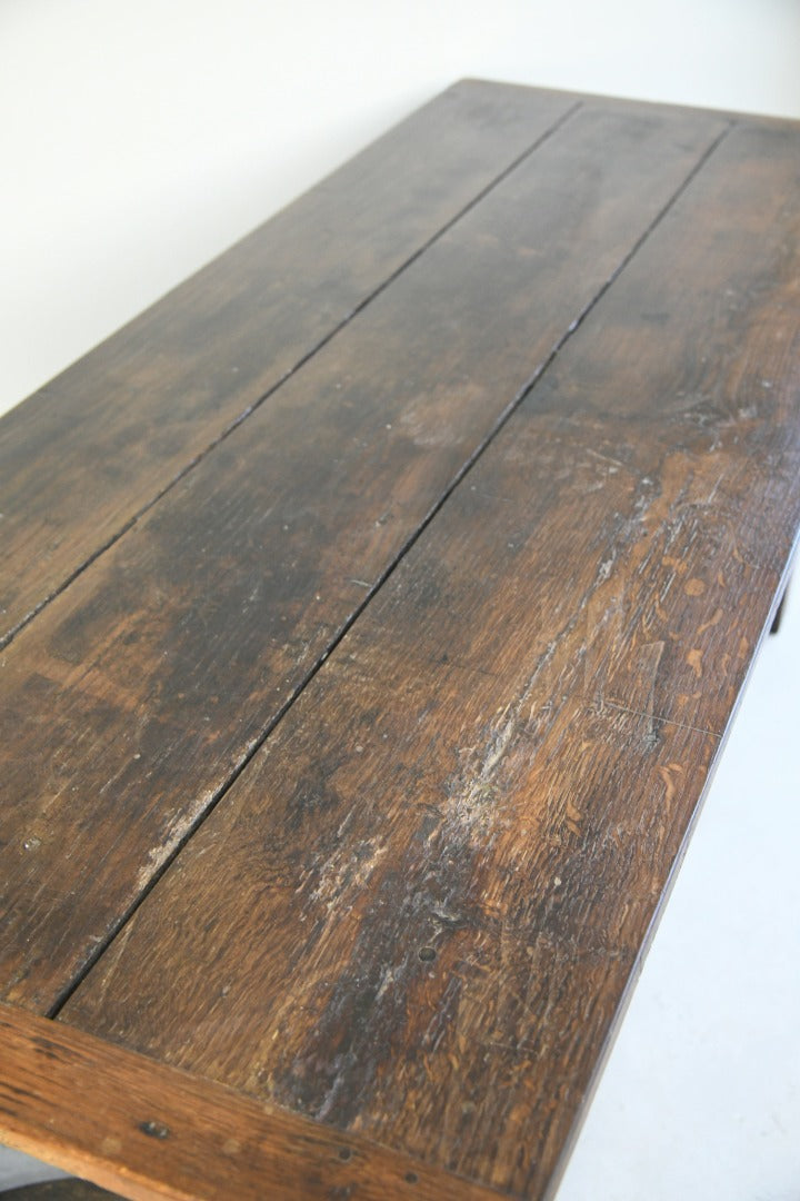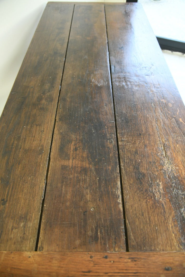 Condition: Solid condition, age and rustic finish, a couple of filled holes to the top of the table, large split in one of the legs - doesn't affect the use, evidence of historic woodworm - this has been treated as a precaution.