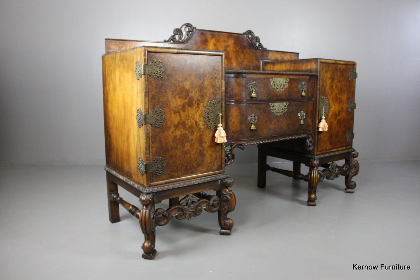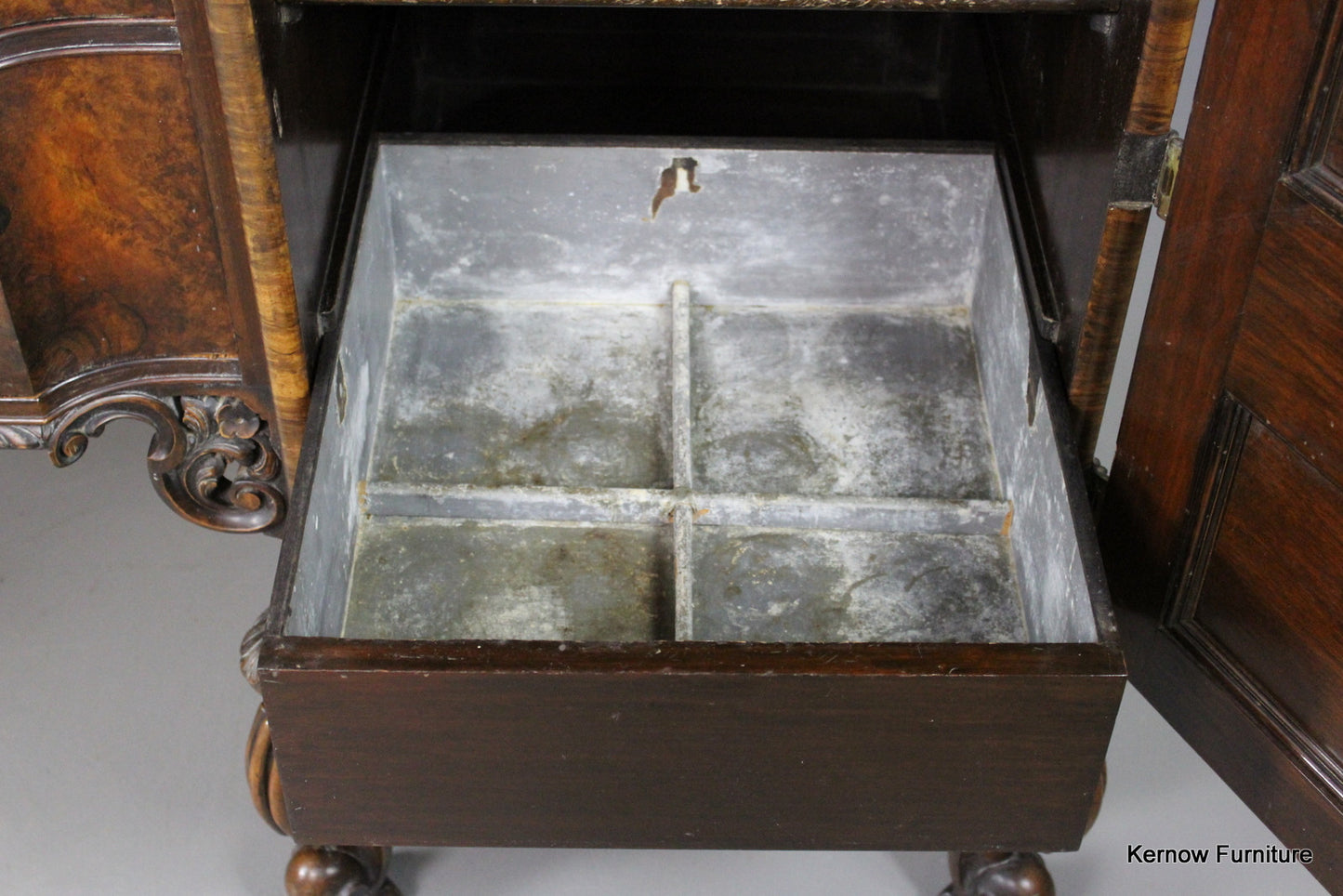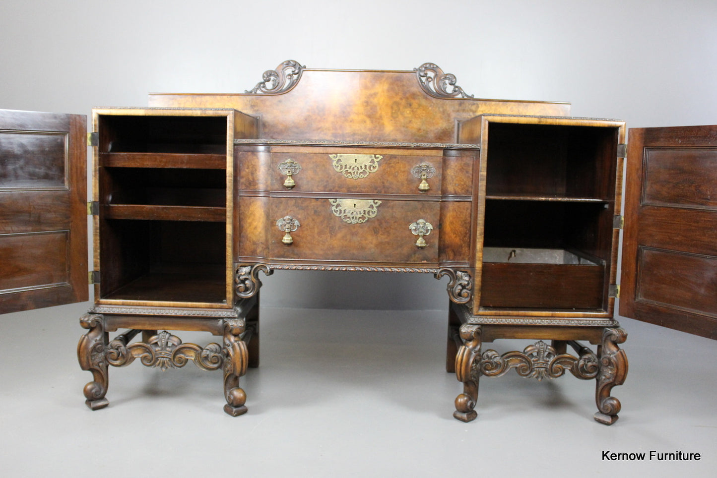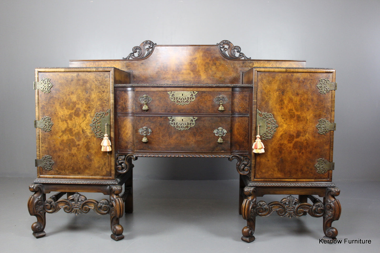 Large 1920's burr walnut sideboard. Pair of central drawers flanked by cupboards with lead lined tray and pair of sliding small internal trays. Ornate pierced brass hinges, escutcheons & brass cherub drop drawer handle with carved ornate stretcher and legs.