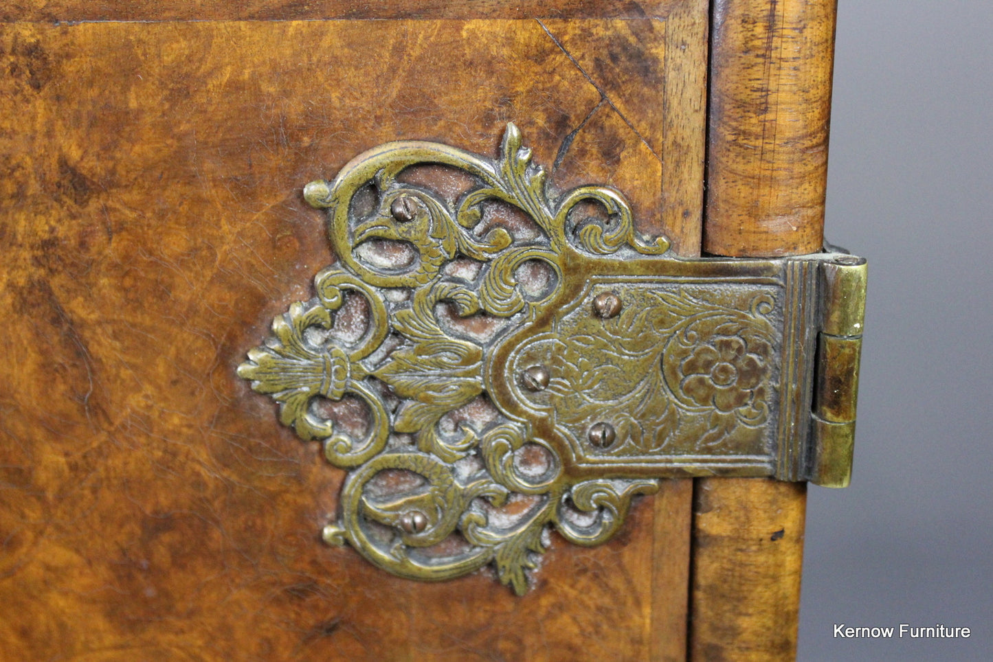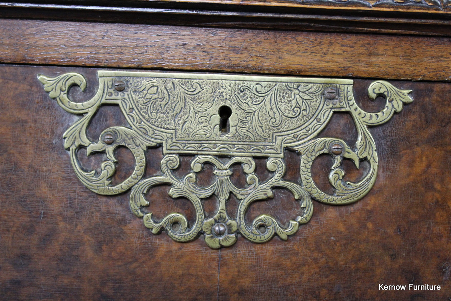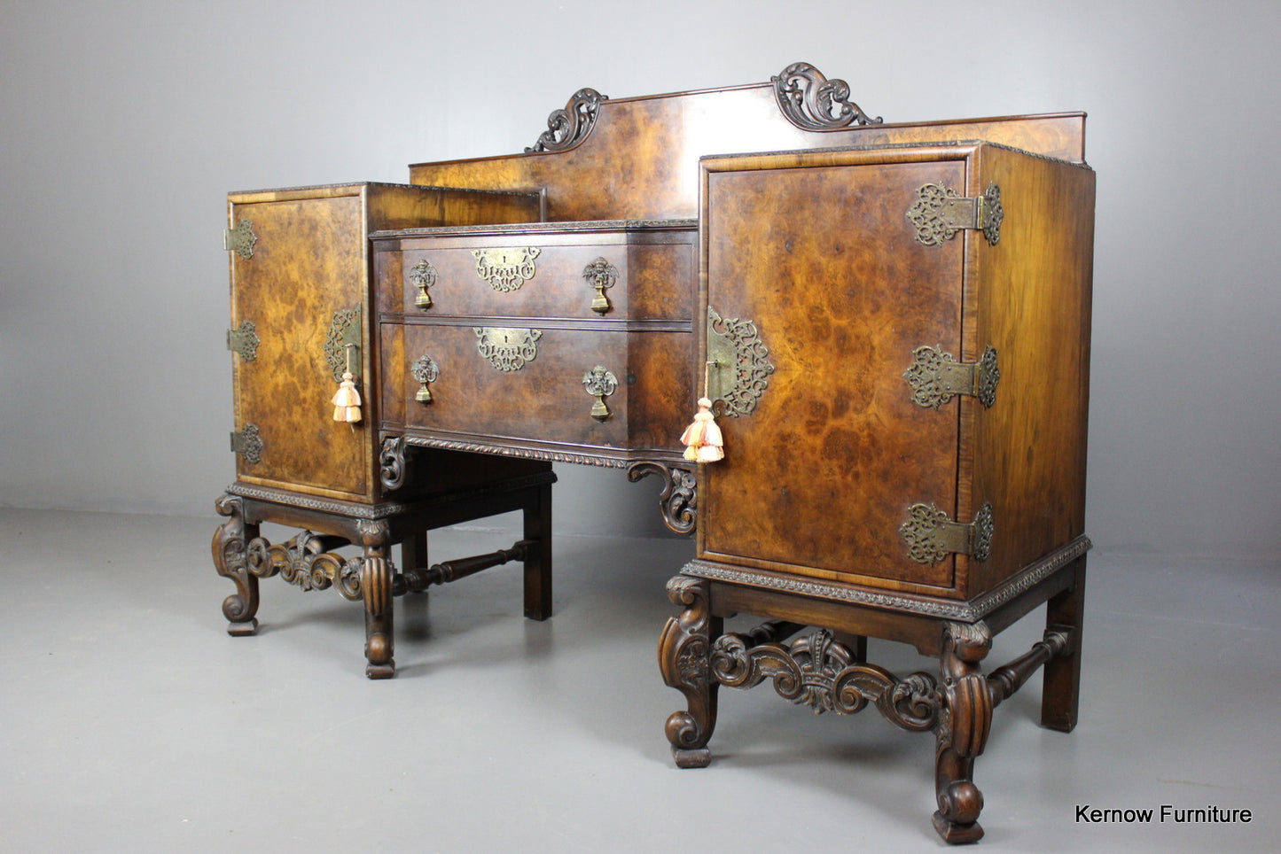 Large 1920's burr walnut sideboard. Pair of central drawers flanked by cupboards with lead lined tray and pair of sliding small internal trays. Ornate pierced brass hinges, escutcheons & brass cherub drop drawer handle with carved ornate stretcher and legs.