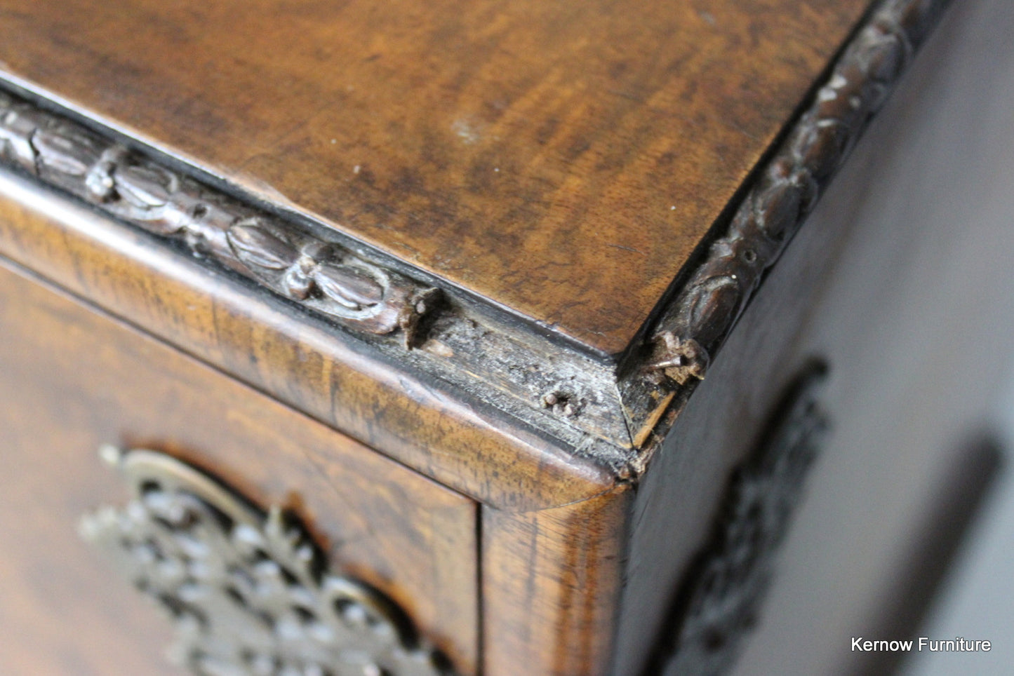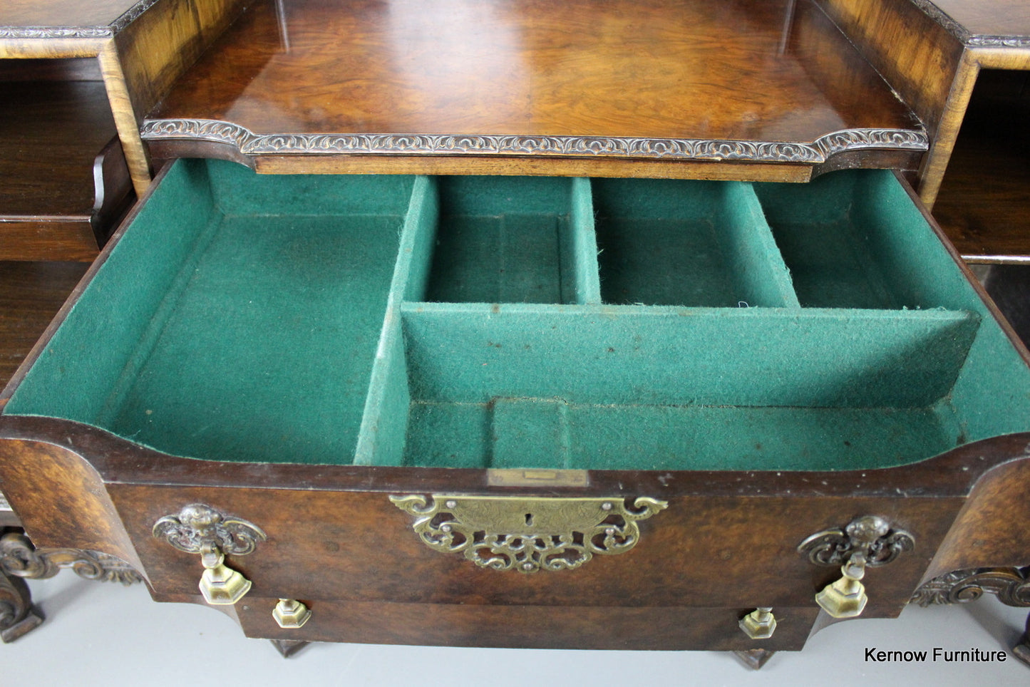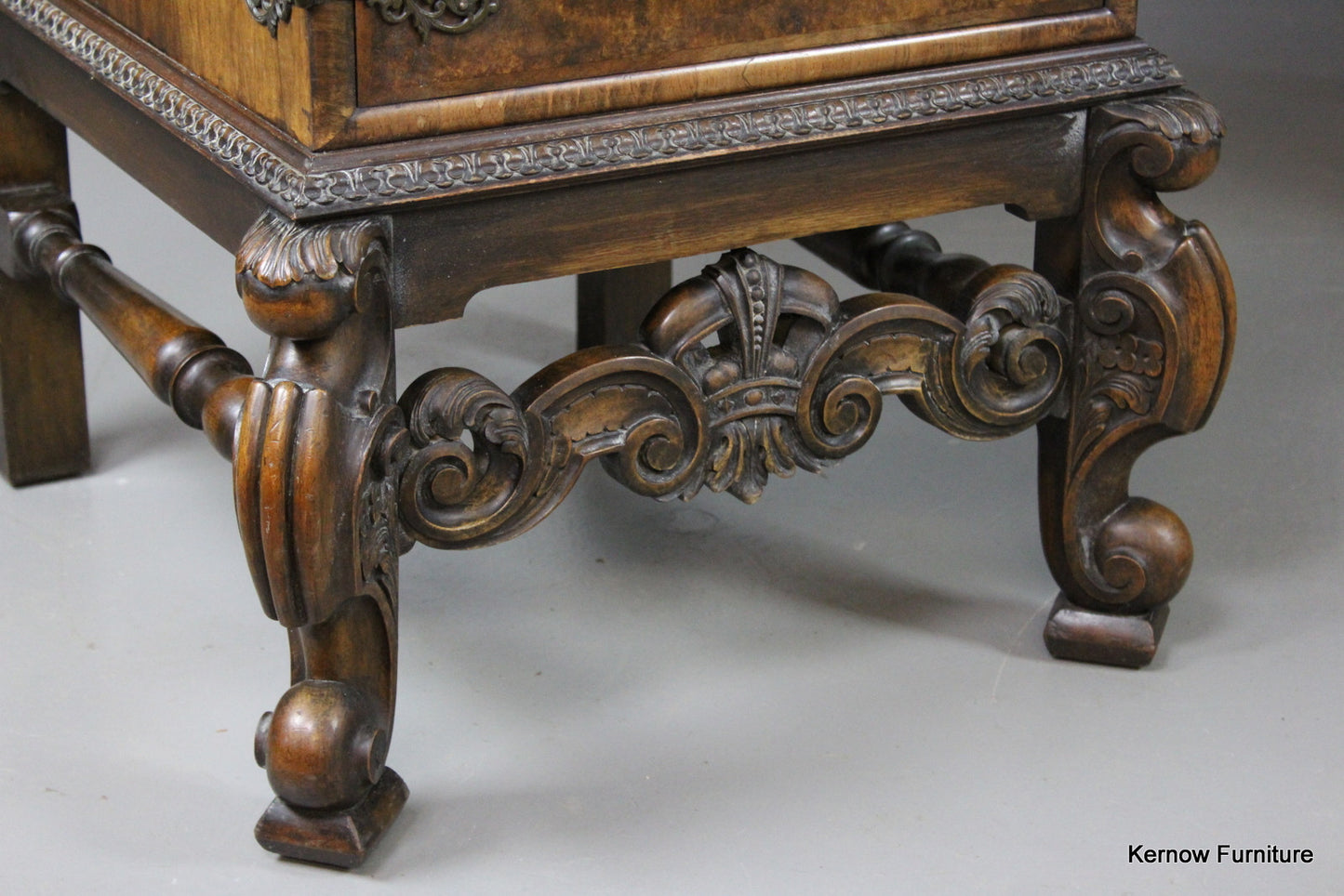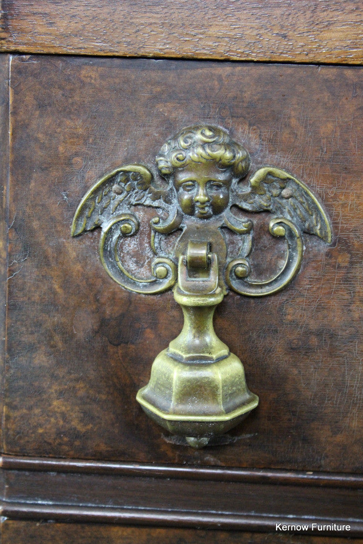 Large 1920's burr walnut sideboard. Pair of central drawers flanked by cupboards with lead lined tray and pair of sliding small internal trays. Ornate pierced brass hinges, escutcheons & brass cherub drop drawer handle with carved ornate stretcher and legs.
