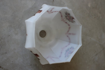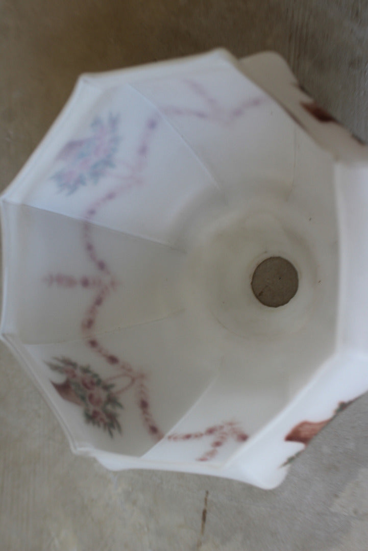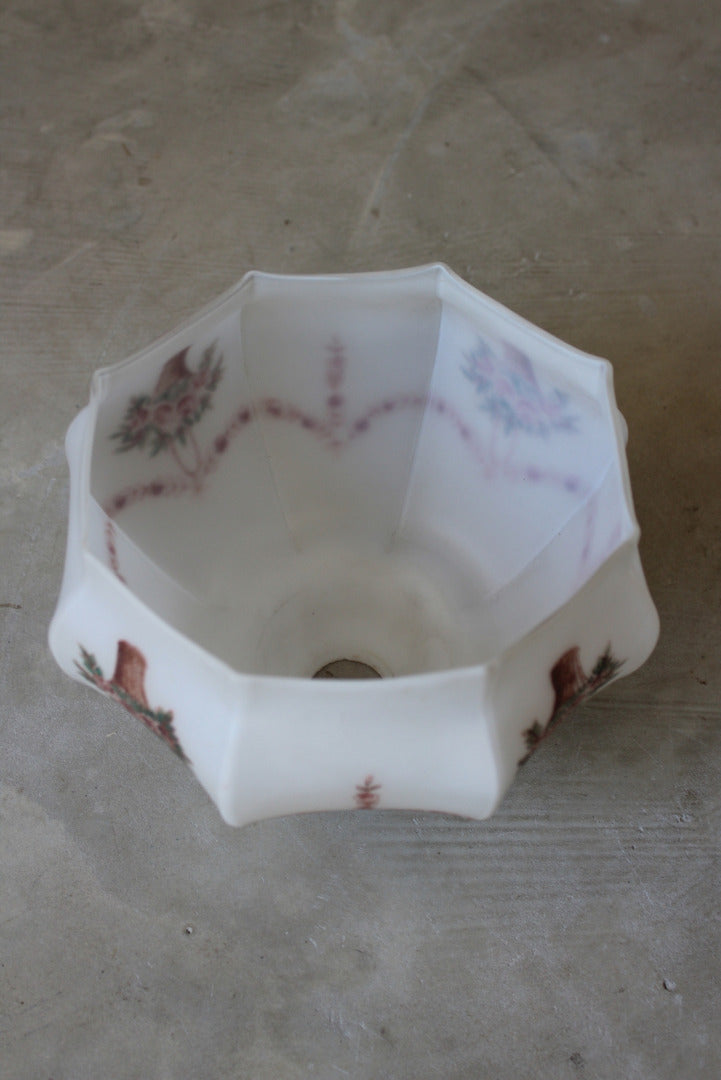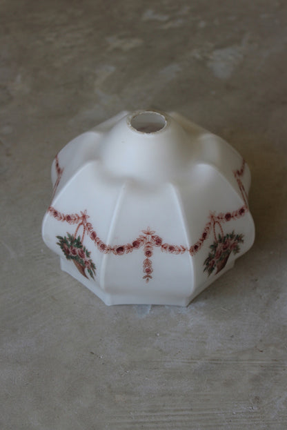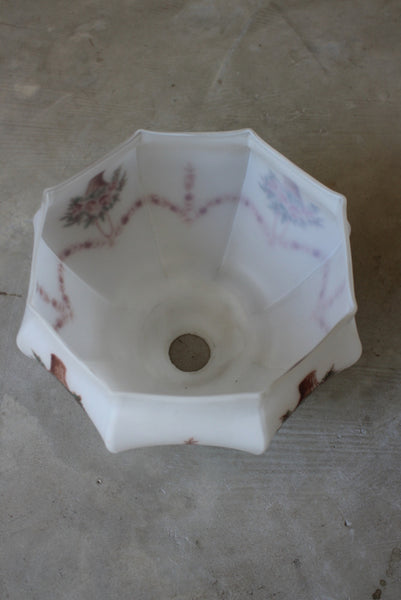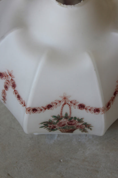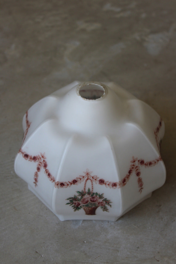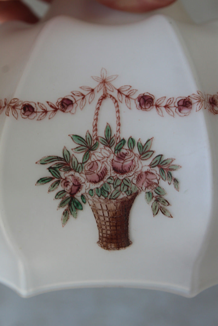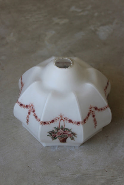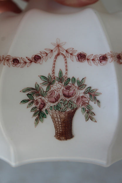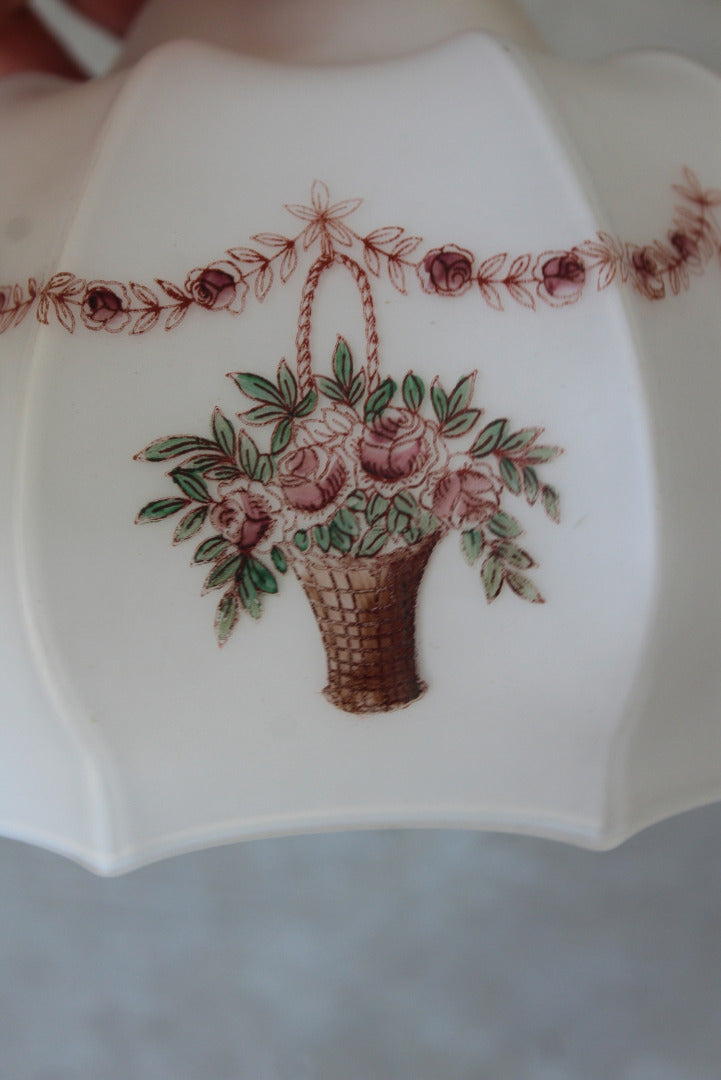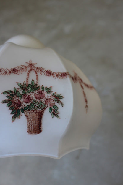 1930s glass lamp shade. White glass shade with floral garland and baskets.