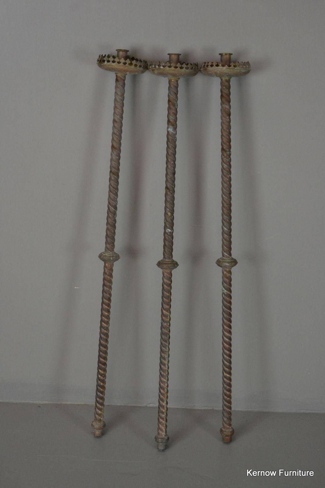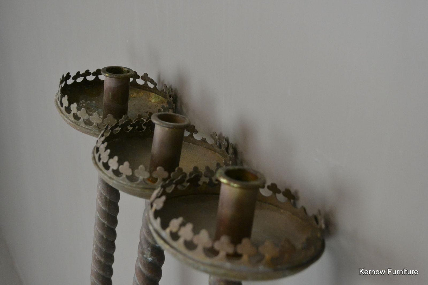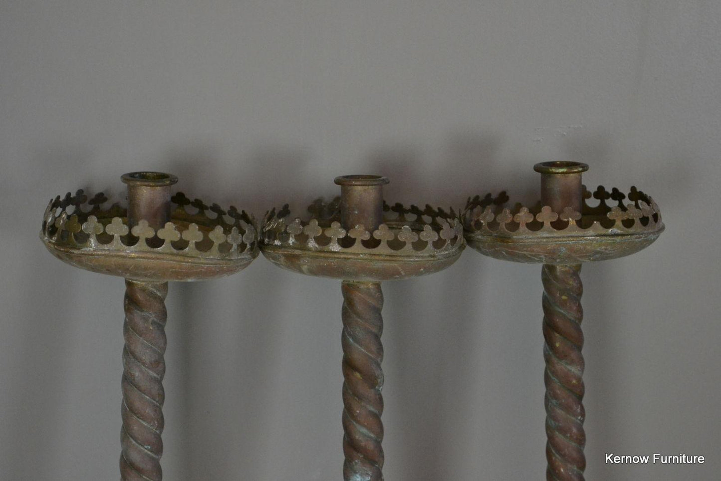 Set of 3 brass wrythen fluted ecclesiastical wall mount candlesticks.
