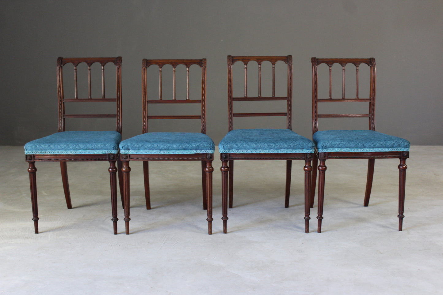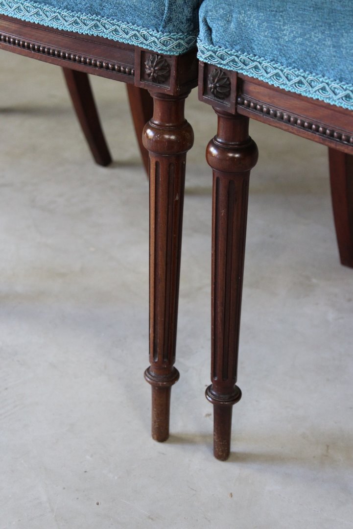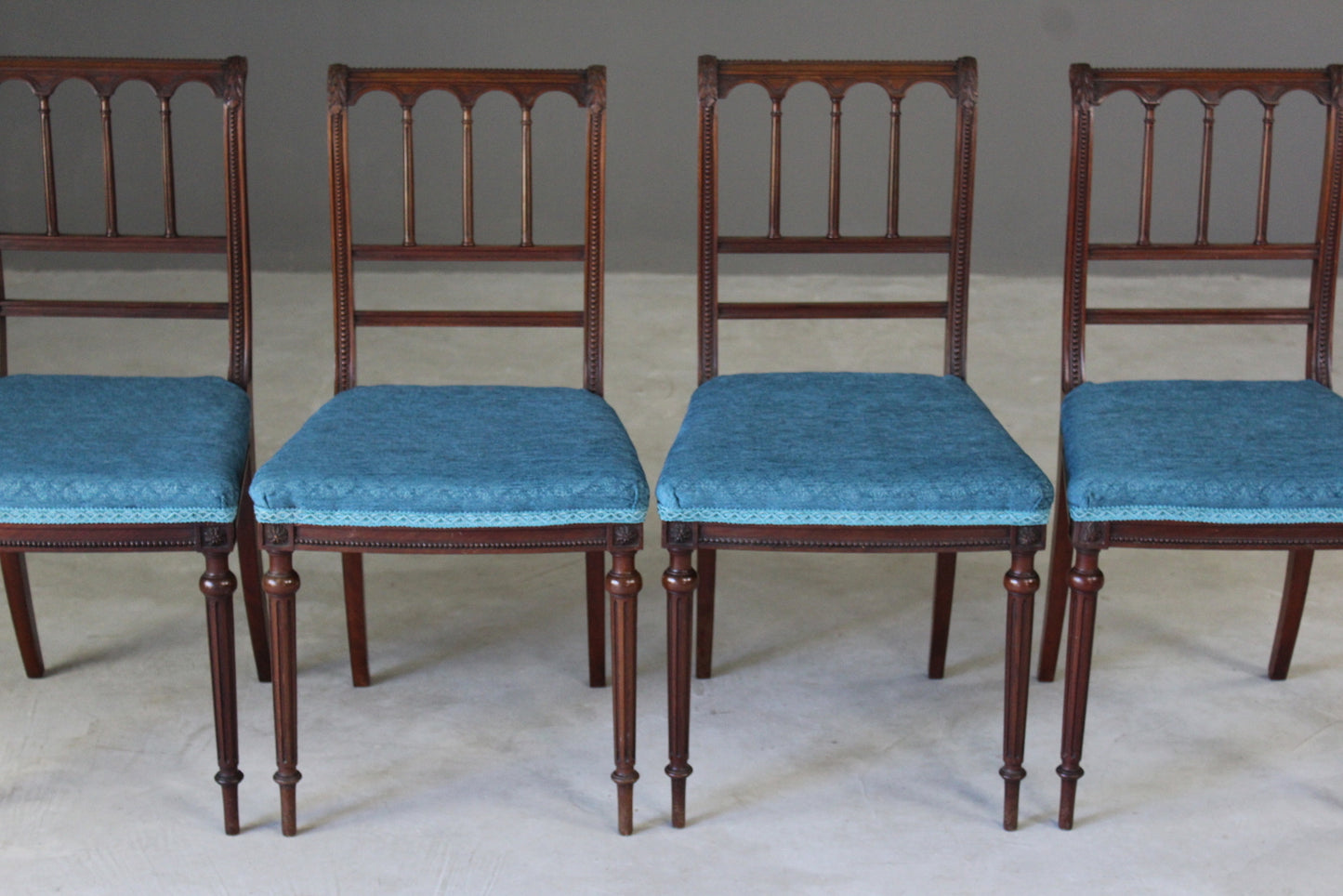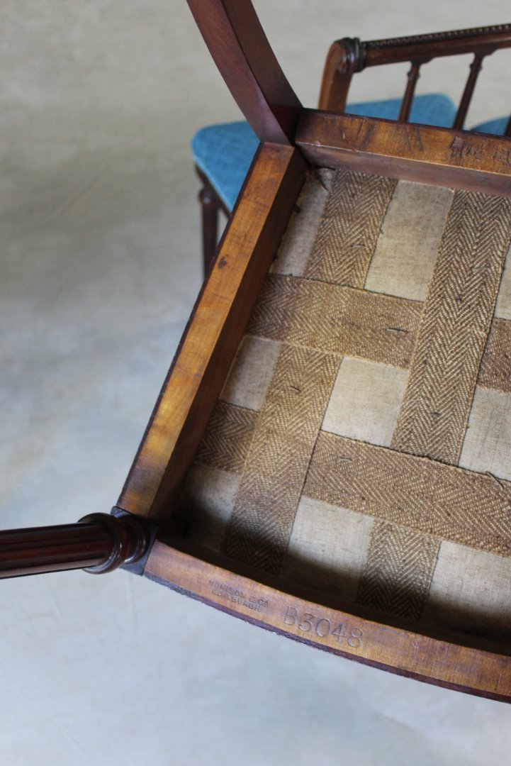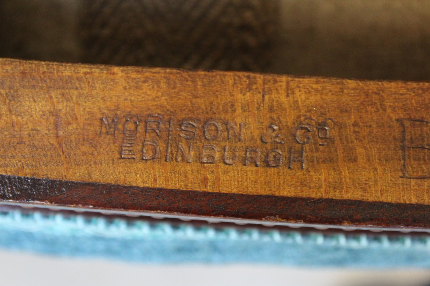 4 Morison & Co mahogany side chairs. 4 early 20th Century mahogany framed occasional chairs, stamped Morison & Co to the underside of the frames, webbed and stuffed blue upholstered seats with carved acanthus leaves on fluted legs.