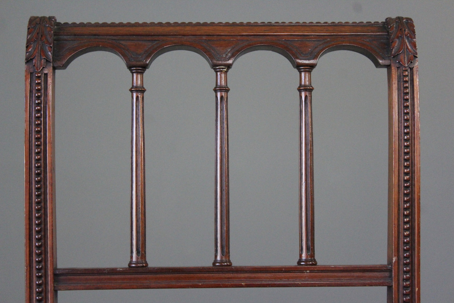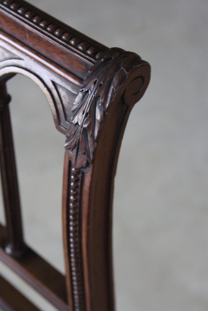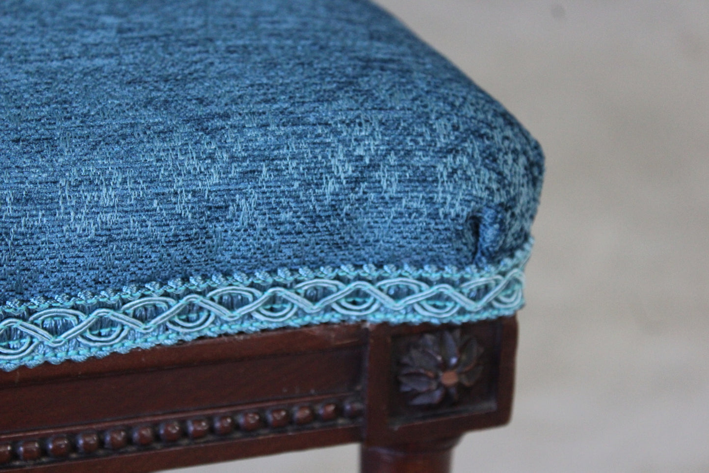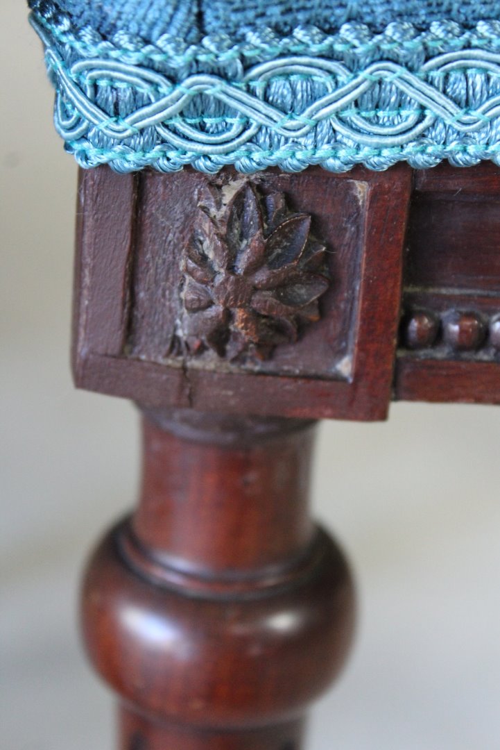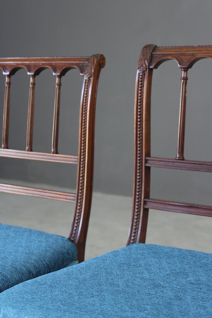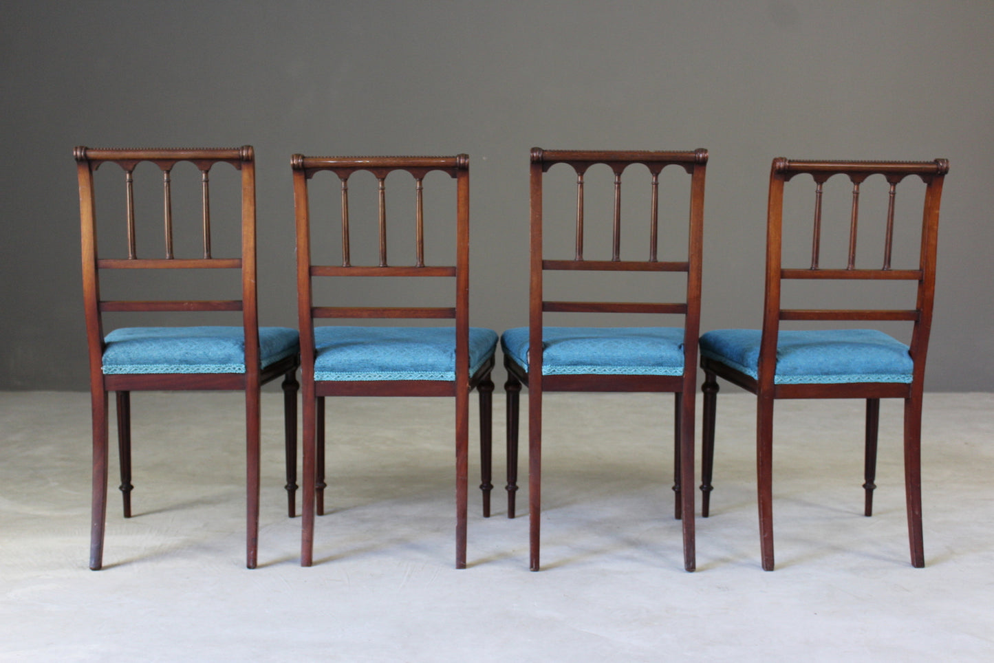 4 Morison & Co mahogany side chairs. 4 early 20th Century mahogany framed occasional chairs, stamped Morison & Co to the underside of the frames, webbed and stuffed blue upholstered seats with carved acanthus leaves on fluted legs.