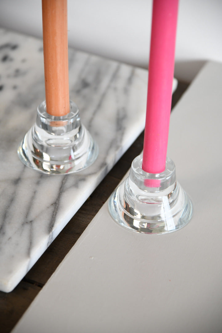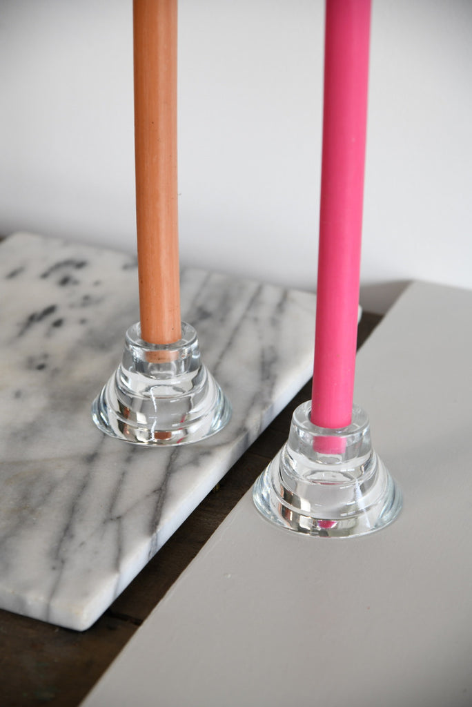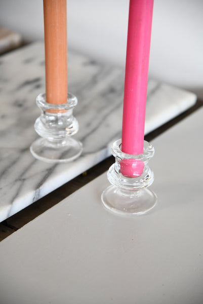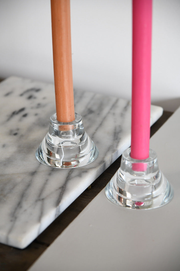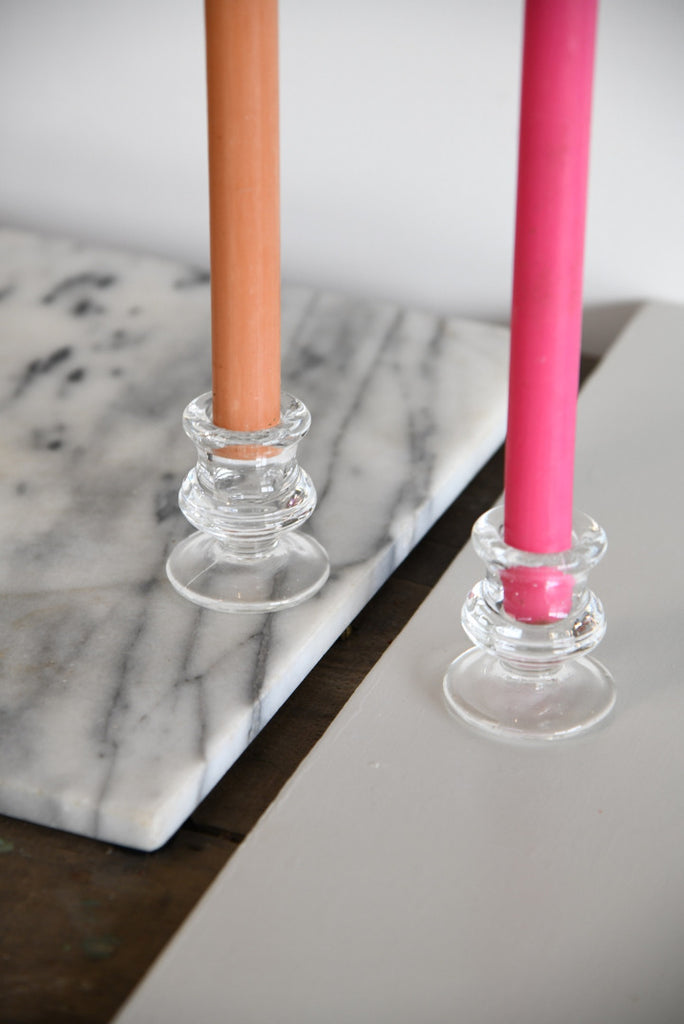4 Vintage Glass Candlesticks. 2 Ikea K Hagberg clear glass candlesticks & 2 other similar clear glass short candlesticks.