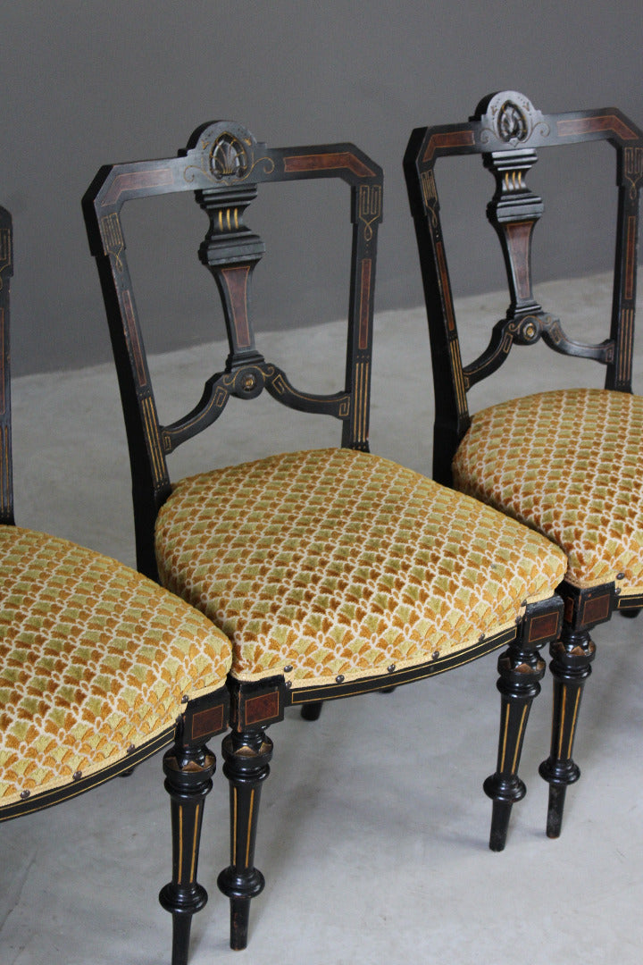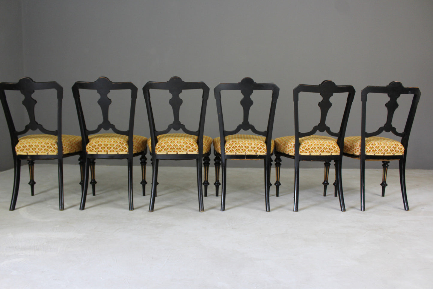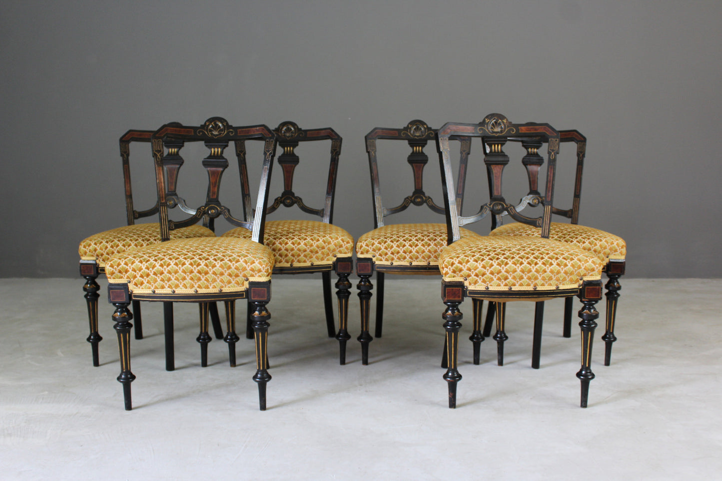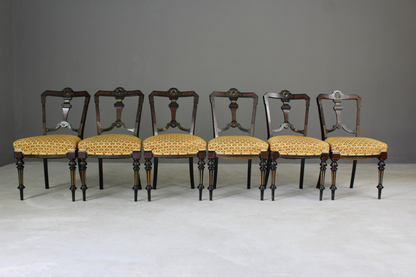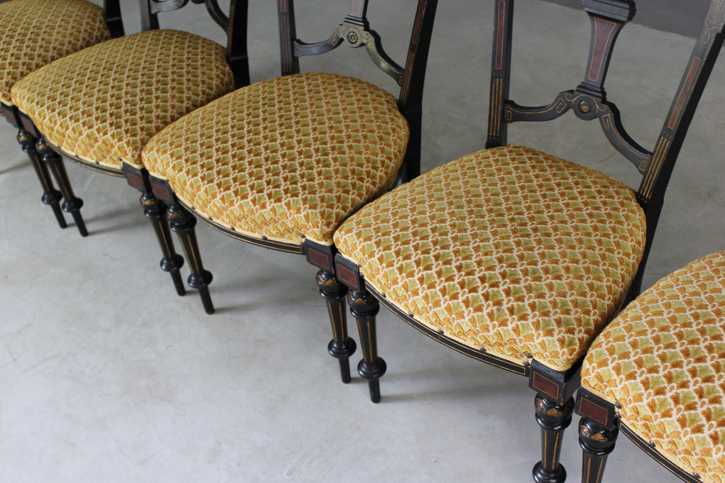 Aesthetic Movement Dining Chairs. Set 6 Aesthetic Movement Victorian dining chairs with ebonised frames and gilt frames, sprung upholstered seats in cut chenille fabric.