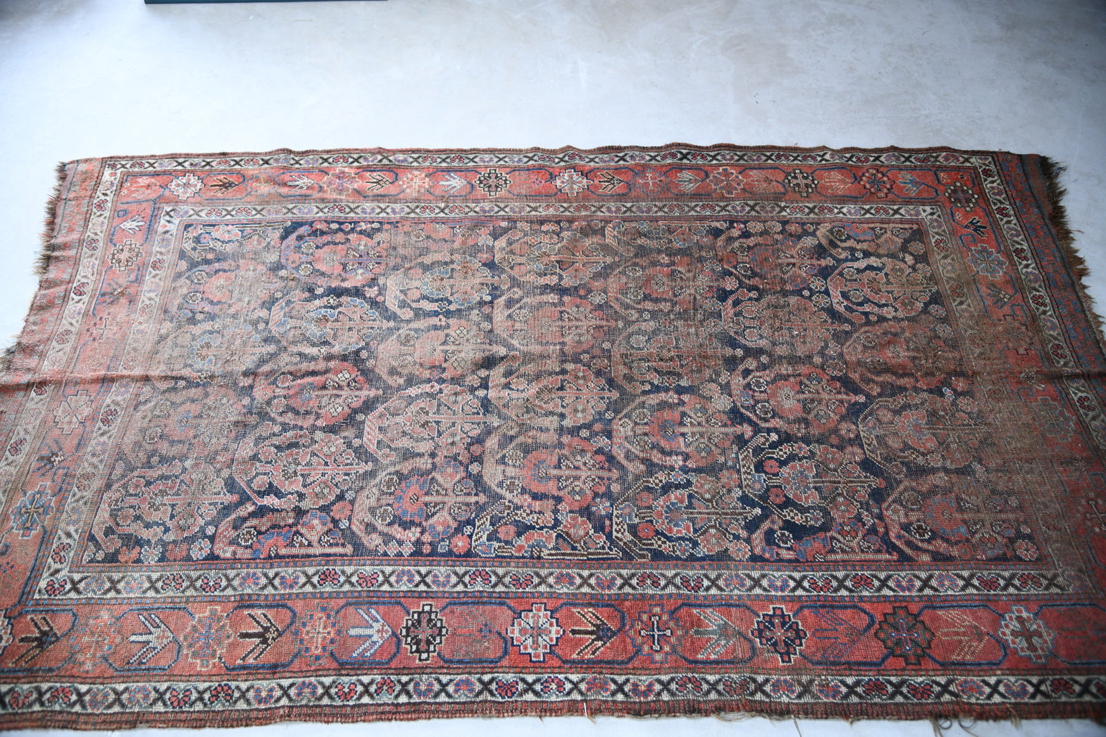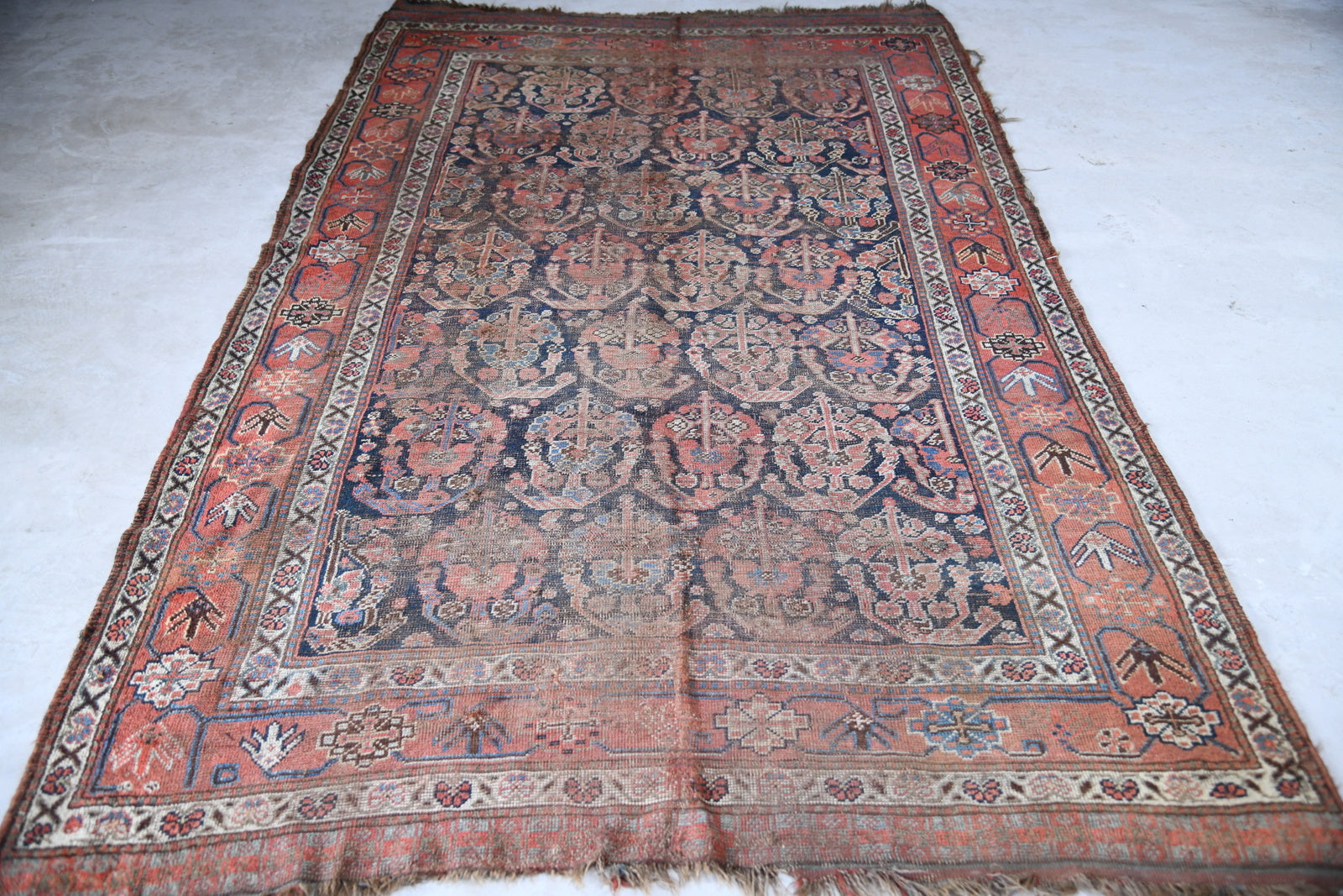 Afshar Rug, South East Persia, Wool on Wool Foundation.Circa 1900 the blue field with all over offset rows of 'in and out' curvaceous boteh within a terracotta red border enclosing continuous stepped cruciform medallions issuing angular bracket vines ending in chevron flower heads, ivory secondary flower head and meandering vine guard borders