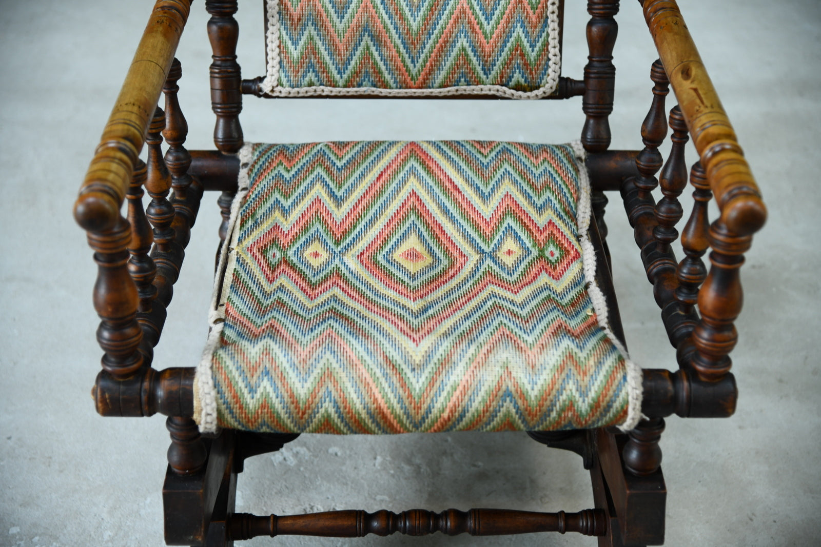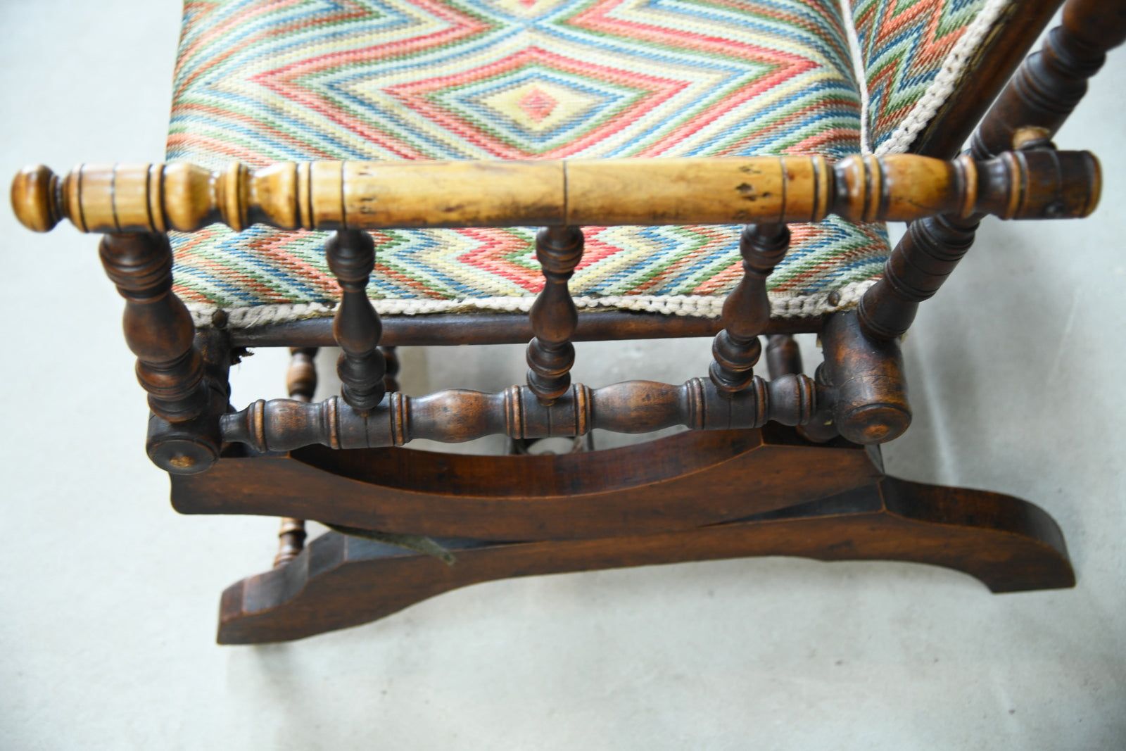 American Rocking Chair. Early 20th Century rocking chair, turned stained beech frame with later tapestry seat and back cover.